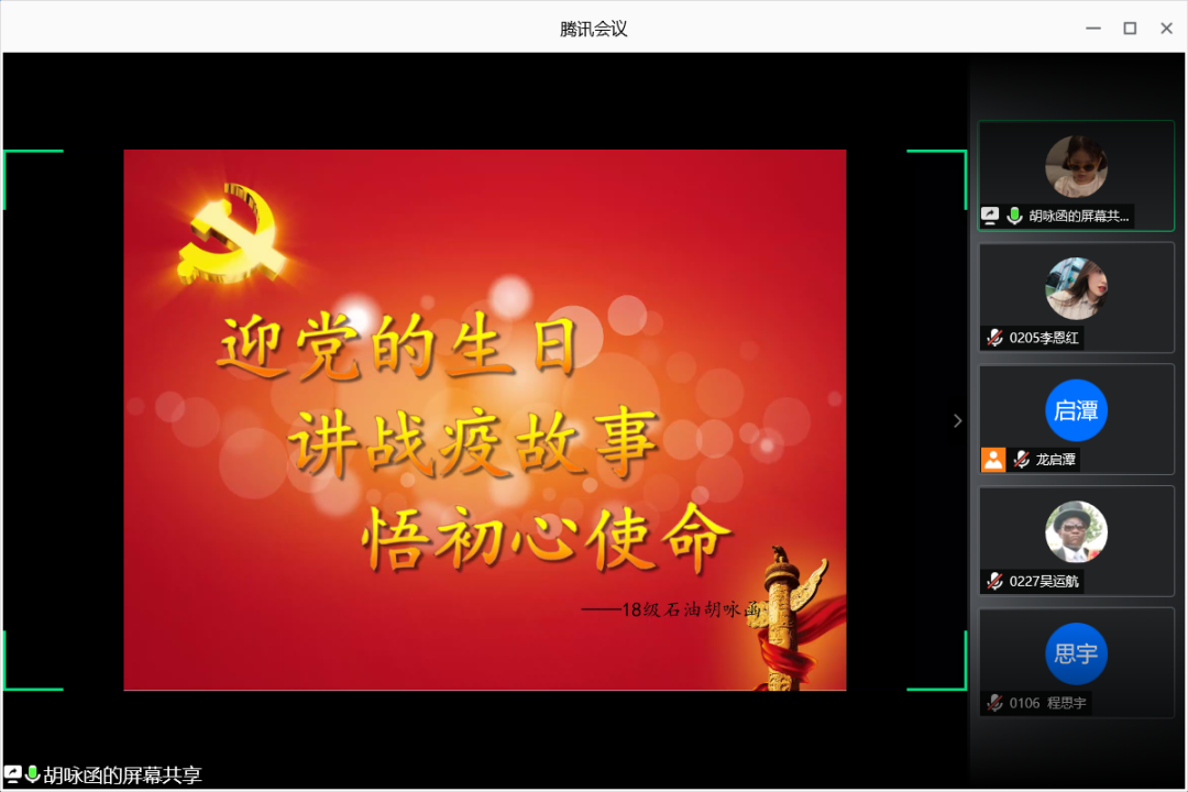 为深入贯彻学习习近平新时代中国特色社会主义思想,强化支部党员的责任担当意识,引导支部党员不忘初心,牢记使命。7月3日晚18点,石油工程学院学生党支部召开以“迎党的生日、讲战疫故事、悟初心使命”为主要内容的线上组织生活会。石油工程学院党总支书记刘雁春、学生党支部书记王昱,支部17名学生党员同志参与本次生活会。