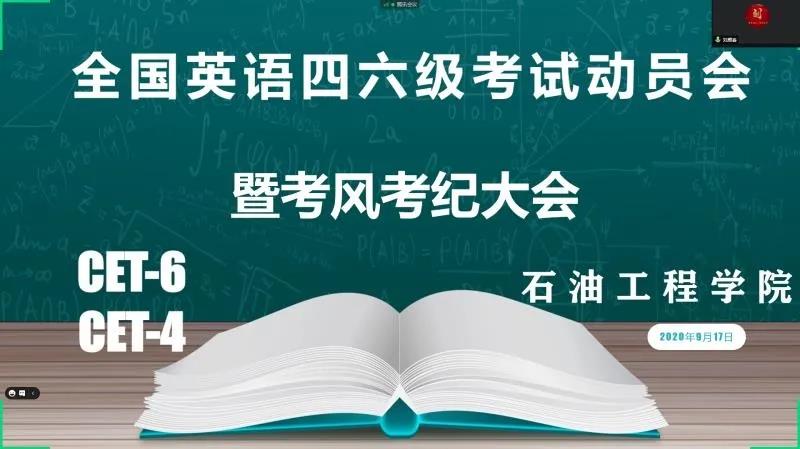 为加强四六级考风考纪建设,使学生牢固树立诚信应考意识,提高同学们的应试技巧,帮助石油工程学院参加英语四六级考试的同学们缓解考前紧张情绪。9月17日晚19点,我院采取线上形式召开全国英语四六级考试动员会暨考风考纪大会,大会由我院党总支书记刘雁春主持。