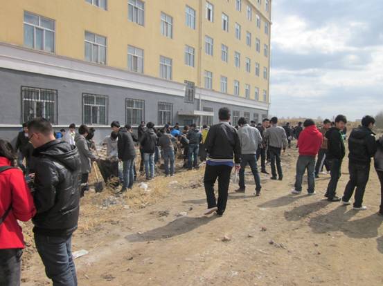 中午放学后,在孙晓平、潘晓亮导员的带领下,08级同学纷纷拿着工具赶到第四公寓楼后进行垃圾清理活动,现场气氛热烈。活动中,大家分工明确,积极主动,认真清理着每处地方。经过全体成员近一个小时的努力,终于将四舍后的杂物清理干净。