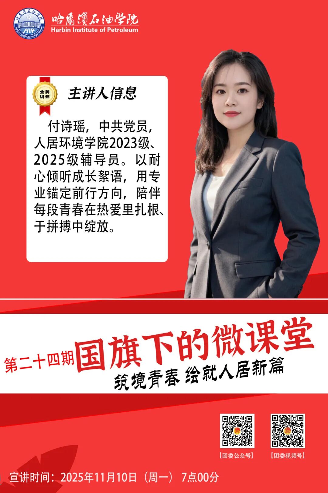 第二十四期“国旗下的微课堂”主讲人为人居环境学院2023级、2025级辅导员付诗瑶,此次微课堂主题为“筑境青春 绘就人居新篇”。