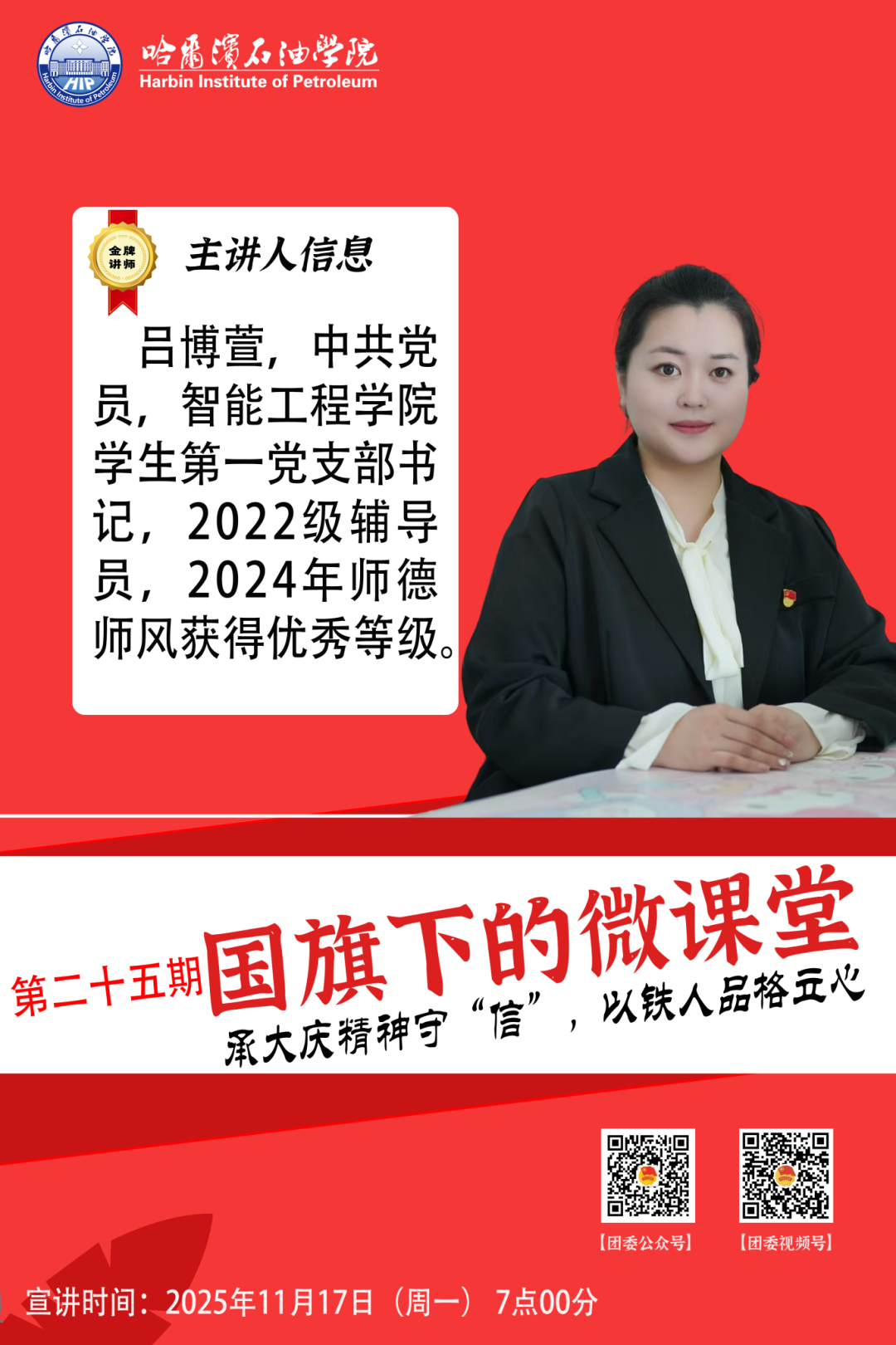 第二十五期“国旗下的微课堂”主讲人为智能工程学院学生第一党支部书记,2022级辅导员吕博萱,此次微课堂主题为“承大庆精神守“信”,以铁人品格立心”。