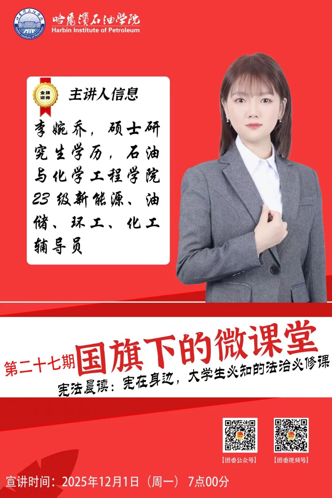 第二十七期“国旗下的微课堂”主讲人为石油与化学工程学院2023级新能源、油储、环工、化工辅导员李婉乔,此次国旗下的微课堂,宪法晨读 《宪在身边,大学生必知的法治必修课》。