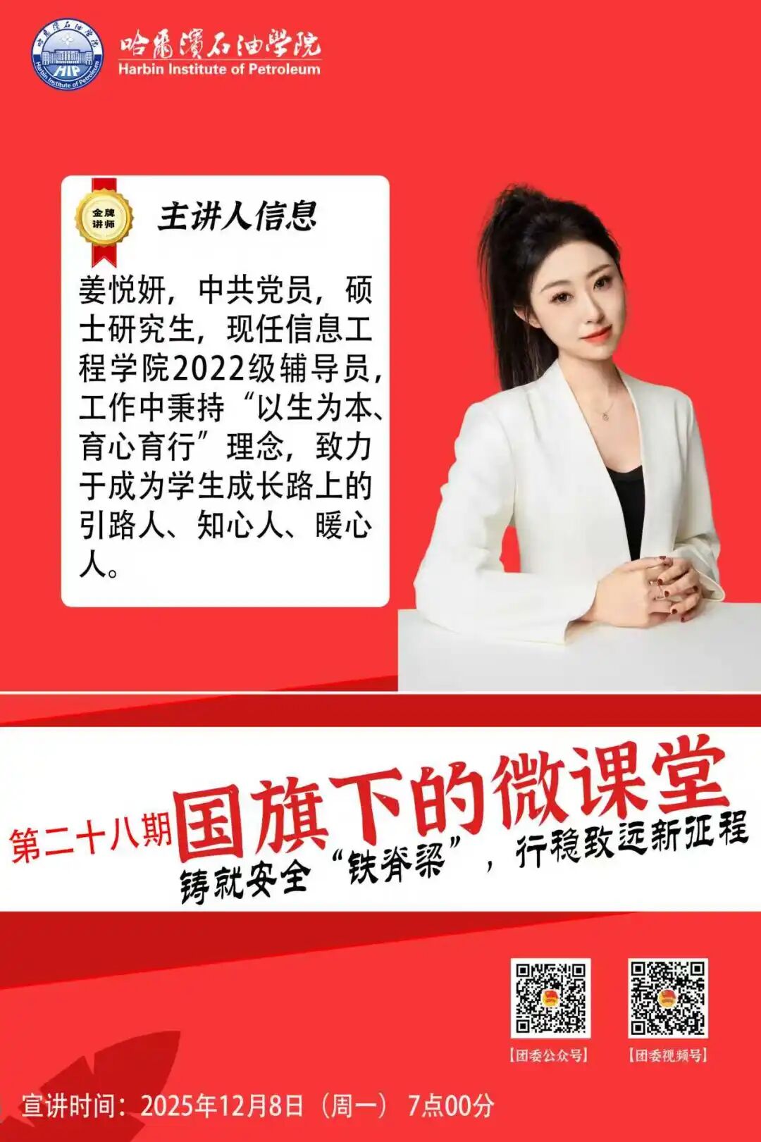 第二十八期“国旗下的微课堂”主讲人为信息工程学院2022级辅导员姜悦妍,此次国旗下的微课堂,《铸就安全“铁脊梁”,行稳致远新征程》。