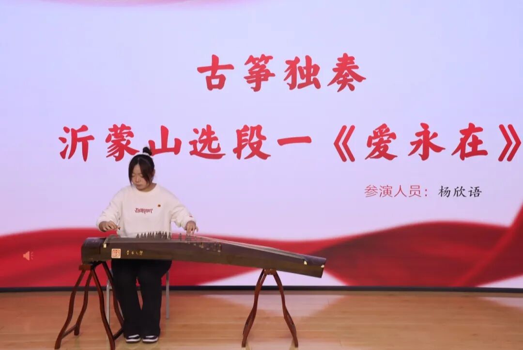 古筝独奏《爱永在》以悠扬婉转的旋律、灵动细腻的指法,将深沉的家国情怀娓娓道来。演奏者以音传情,让同学们在袅袅琴韵中沉浸式感受“爱”的多元维度——既有对革命先烈舍身取义的崇敬之爱,也有对祖国山河与人民的深情之爱。它不仅带领大家触摸到藏在旋律里的红色记忆,更唤醒内心对家国情怀的共鸣。