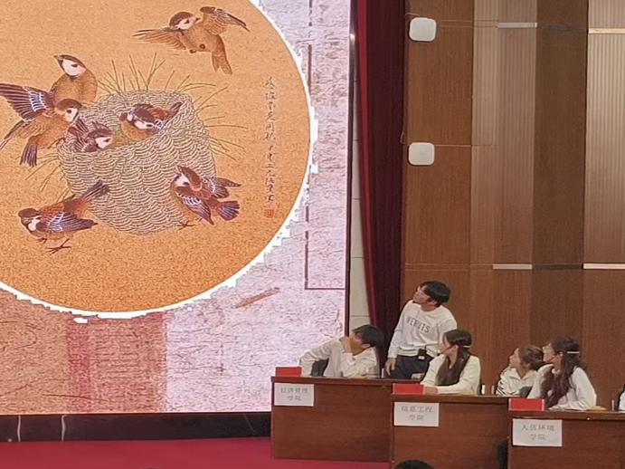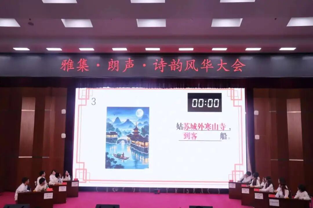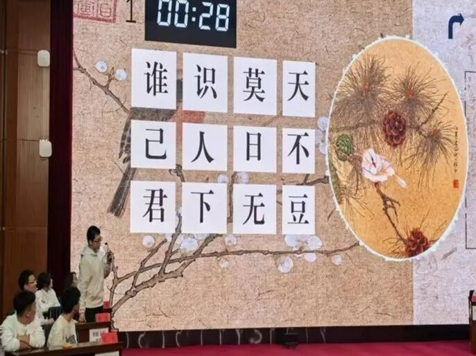 最引人瞩目的“诗词抢答”环节则将气氛推向高潮。主办方精心设计了“名句填空”“意象识别”“诗词接龙”三大模块,题目涵盖唐诗宋词、元曲小令,兼顾经典性与趣味性。随着主持人念出题目,各班级代表队成员迅速按下抢答器,反应敏捷者从容作答,偶有迟疑时同队伙伴立刻补充,团队协作的默契与对诗词的热爱在赛场充分彰显。当遇到“‘春风又绿江南岸’的下一句”“‘但愿人长久’的出处”等经典题目时,台下观众也忍不住轻声附和,形成台上台下共品诗韵的热闹场景。