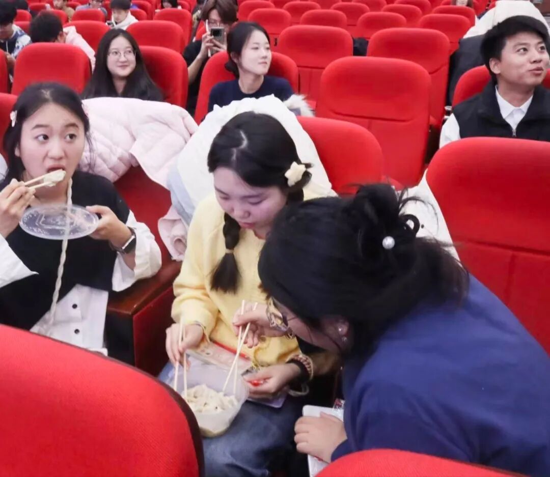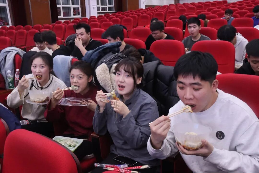 一盒盒饺子传递着温暖,同学们的脸上倦意尽消,洋溢着幸福的光彩。这份惊喜的立冬问候,让排练现场温情满溢。饰演王进喜的李彬同学感慨道:“排演虽苦,但学校的深切关怀让我们动力倍增。我们必将这份感动化为舞台上最真挚的演绎。”