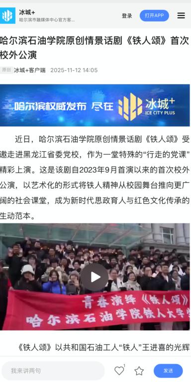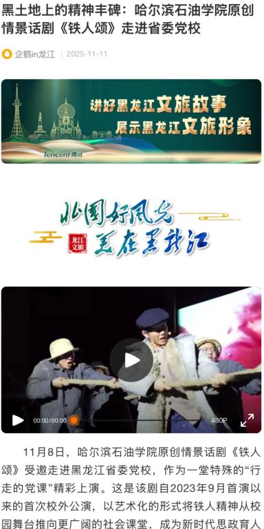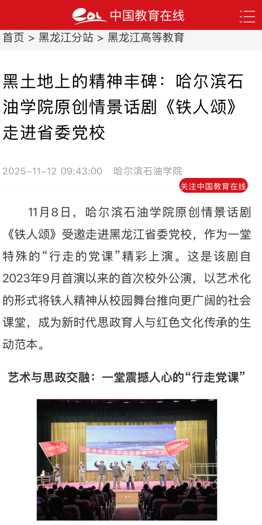 该剧先后斩获黑龙江省大学生艺术展演戏剧一等奖、全国石油高校文化作品微电影一等奖,铁人大学生话剧团更获评首批省级优秀艺术团,彰显了“以文化人、以美育人”的显著成效。