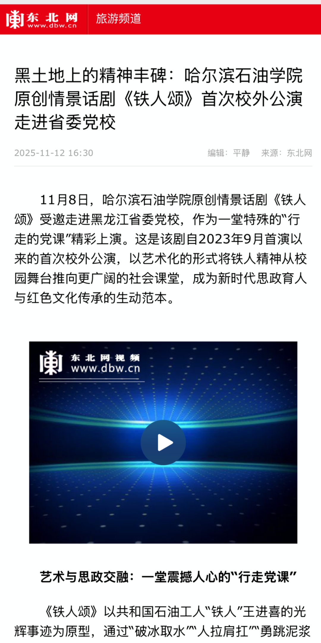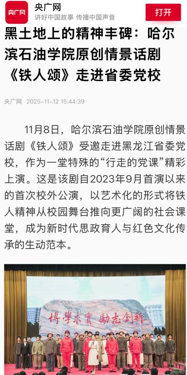 学校通过“展演—景观—叙事”三维文化场域,将铁人精神深度融入校园文化建设:铁人雕像广场、铁人精神育人馆与情景话剧《铁人颂》共同构建起沉浸式育人生态。此次省委党校演出,是学校推动铁人精神“走出校园、服务社会”的重要实践,通过艺术形式生动诠释了中国共产党人的精神谱系,为新时代传承红色基因提供了鲜活载体。