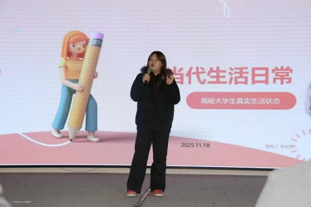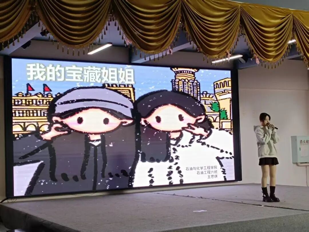 本次大赛聚焦大学生活、社会热点等多元话题。外国语学院陈路的《我的大学方言联合国》,方言梗引发观众强烈共鸣;信息工程学院张骞予的《我的高质量大学生活》,以“反套路”幽默诠释“高质量”;石油与化学工程学院王思琪的《我的宝藏姐姐》,在“宠妹”与“互坑”日常中收获全场共鸣;人居环境学院黄帅玮的《以梦为马,赴一场大学滚烫青春》,将热血与幽默融合;智能工程学院韩宝国的《论大学生的自我修养》,分享“自我修养”的另类内涵;艺术与教育学院李明洁的《当代干饭人的精神状态报告》,精准戳中“干饭人”精神世界,引发全场爆笑。