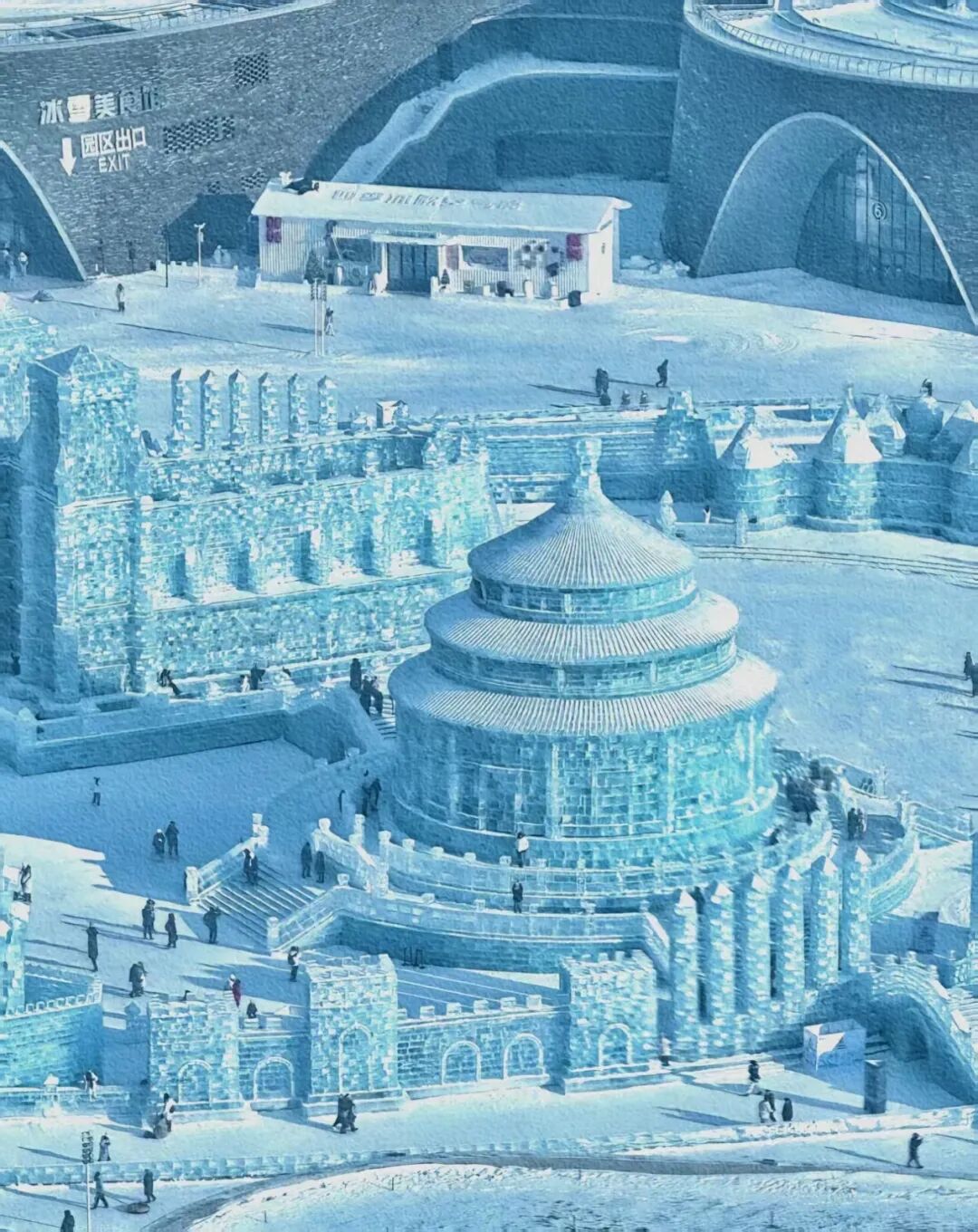 夕照铺染巴彦稻田,金绿交织,“巴彦苏苏 富饶之乡”稻画轻晃,黑土混稻花香萦绕,是刻在骨子里的家乡富饶模样。阜财门红灯笼亮如乡眸,夜灯裹墙,影斜铺阶,乡愁悄然漫上心头。哈尔滨冰砌冷蓝轮廓,冬寒凝暖,冰穹下人潮欢腾,风裹凉意仍是儿时温度,它是世界冰雪城,亦是学子心中凝霜的老地方。而在夏日哈尔滨天蓝如洗,双子钟楼暖黄浸光,连廊温软,草甸浅绿,江风轻拂檐角,清爽惬意。