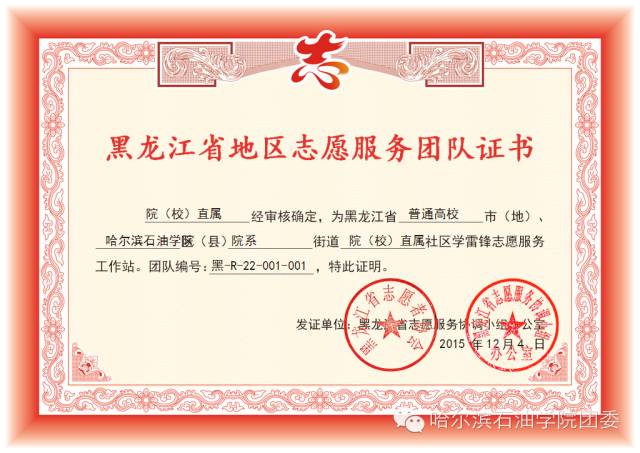 2015年12月4日,我院青年志愿者协会荣获黑龙江省2015年度优秀志愿服务队称号。本次活动是由黑龙江省精神文明建设指导委员会组织评选,目的是为了贯彻落实全国精神文明建设表彰暨学雷锋志愿服务工作推进会议和中央文明委2015年工作安排。