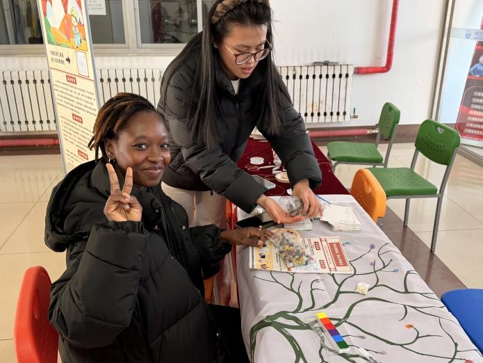 活动正式开始后,志愿者在场地内布置好活动宣传物料,吸引广大师生前来摊位前了解并参与活动,他们身着红色志愿马甲,穿梭于人群之中,耐心细致地为师生讲解活动内容与参与流程。活动现场,中外青年学生携手协作、友好互动,在轻松愉悦的体验中交流文化、增进情谊。