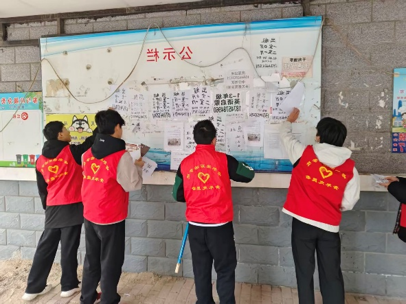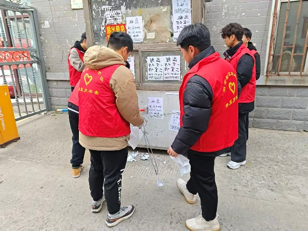 活动伊始,志愿者们手持扫帚、垃圾袋,弯腰俯身细致清理道路两侧的落叶与纸屑,指尖翻飞间将散落的杂物一一收纳;面对墙面、单元门上顽固的小广告,他们用铲刀小心翼翼地反复刮拭,不放过任何一处污渍,让蒙尘的公共设施逐渐恢复整洁原貌。