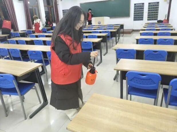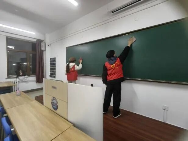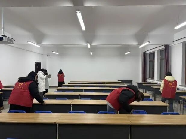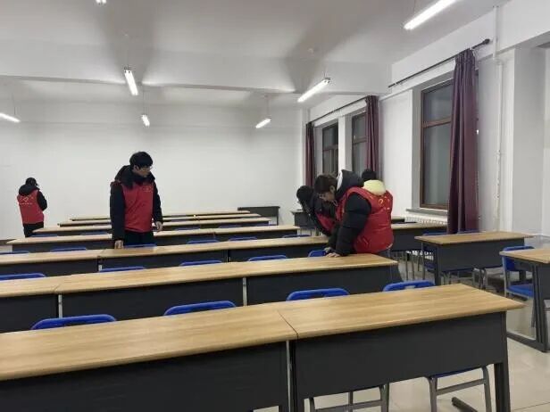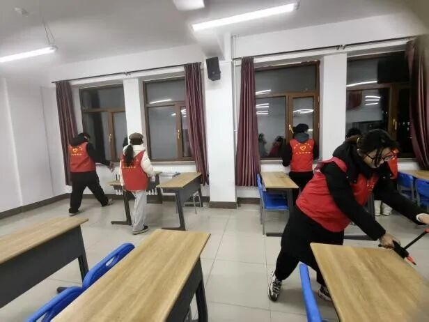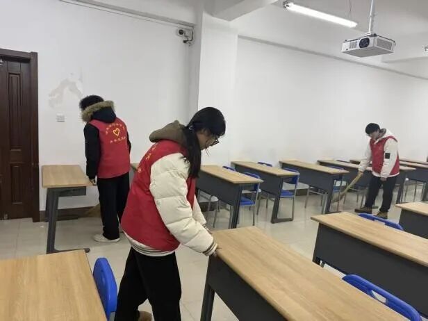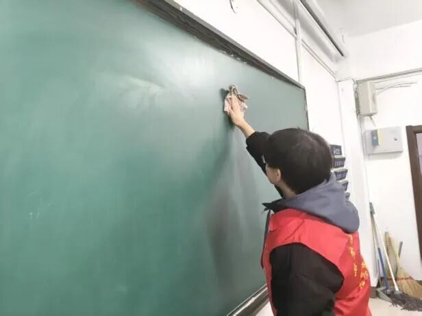 活动当日,志愿者们于第二教学楼准时集结,领取工具后迅速投入工作。现场分工协作:擦拭课桌、讲台及黑板以清除污渍笔迹,清扫地面纸屑杂物并排查卫生死角,规整课桌椅摆放。志愿者们秉持实干精神,以严谨态度落实清洁任务,不放过一处积尘、不遗漏一个角落,用双手细致打磨着校园里的每一处细节。