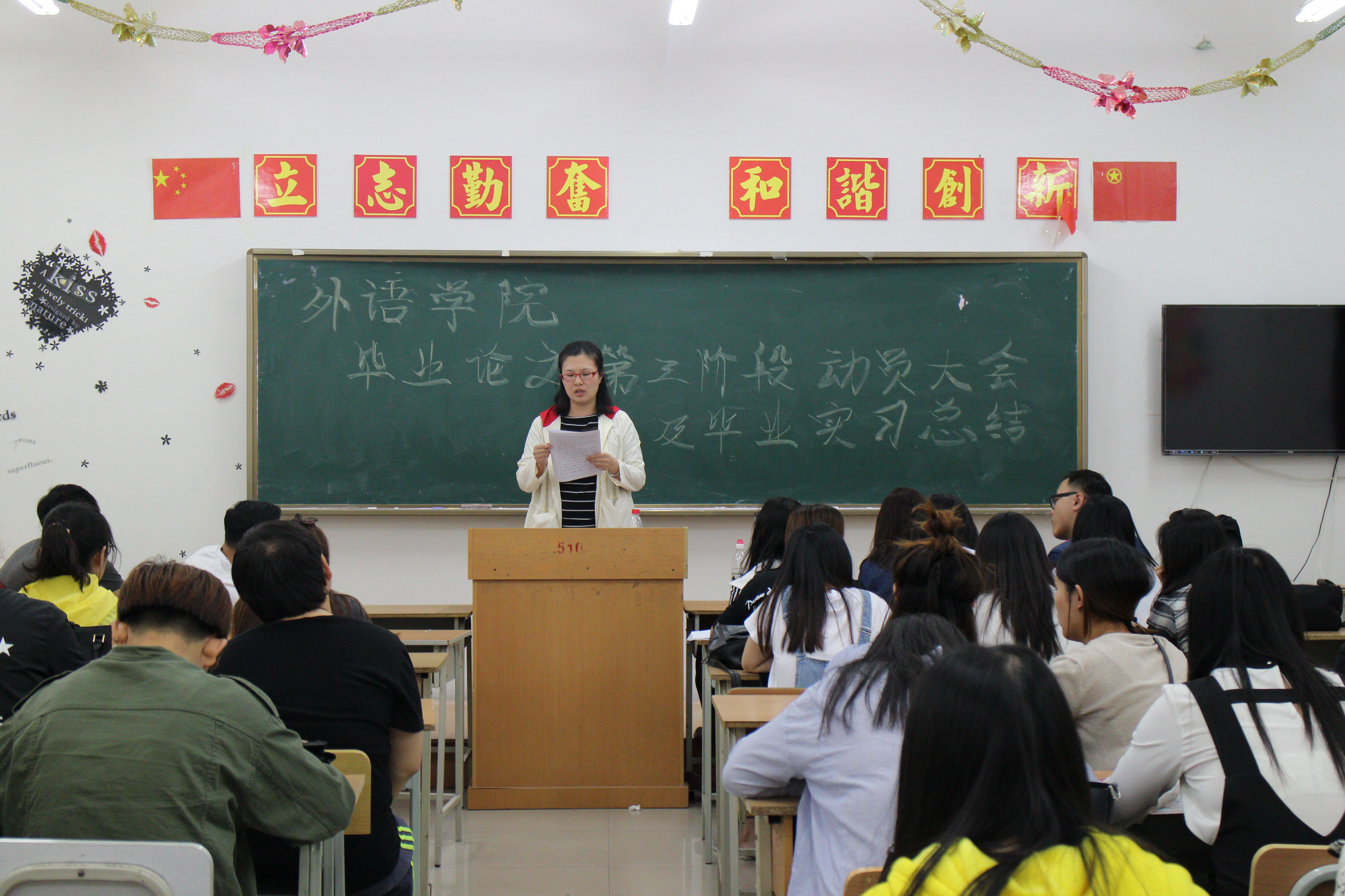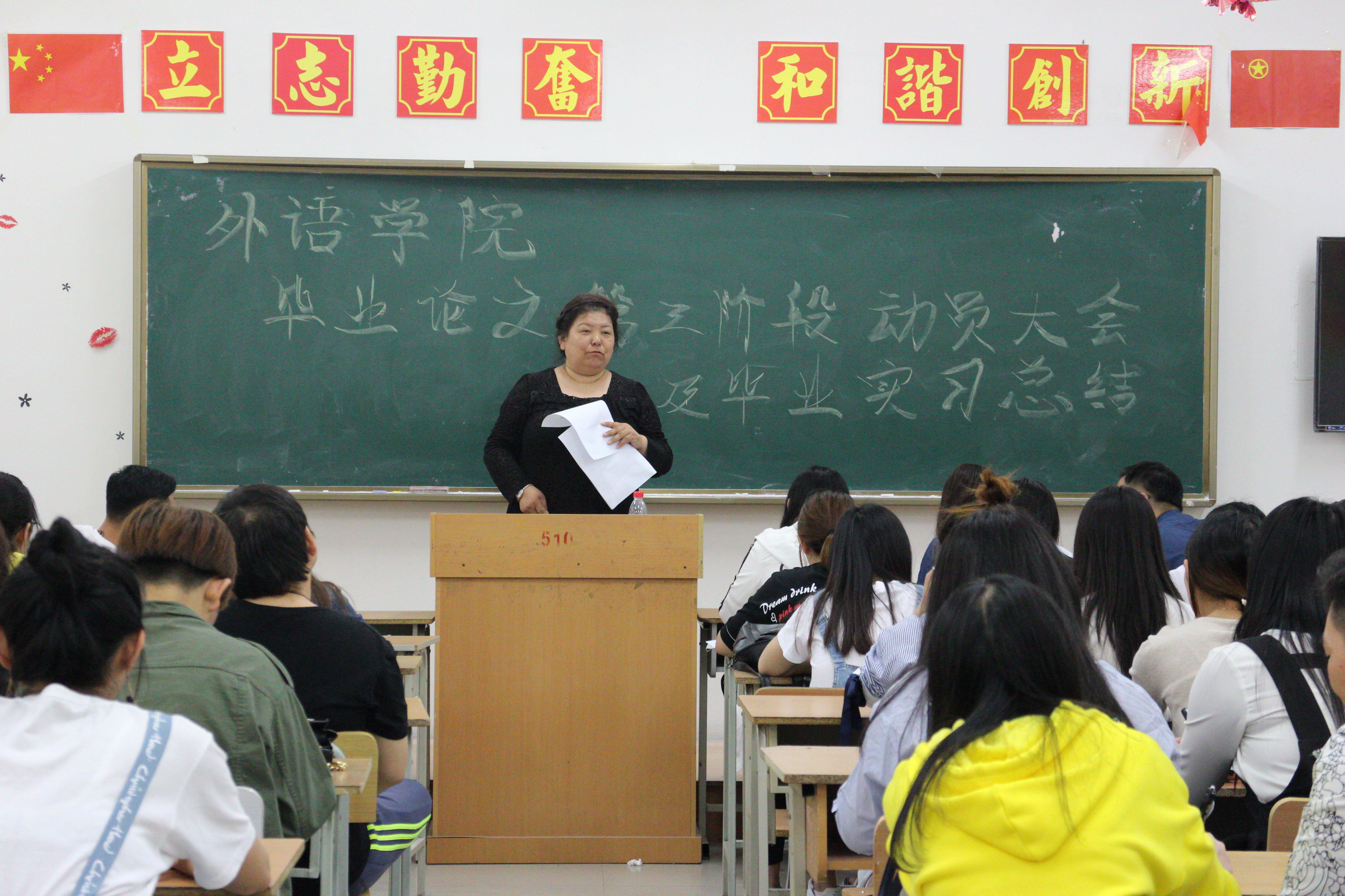 以昂扬激情,踏实习征程。在这春风习习,阳光熙熙的毕业季,我院于2017年5月16日中午12时50分召开外语学院暨毕业论文第三阶段动员大会及毕业实习总结。此次活动于主教510顺利召开,出席本次活动的嘉宾有外语学院院长王丽娅,外语学院团总支书记孙晓萍,外语学院指导老师徐梅,外语学院俄语系班主任乔雪等。