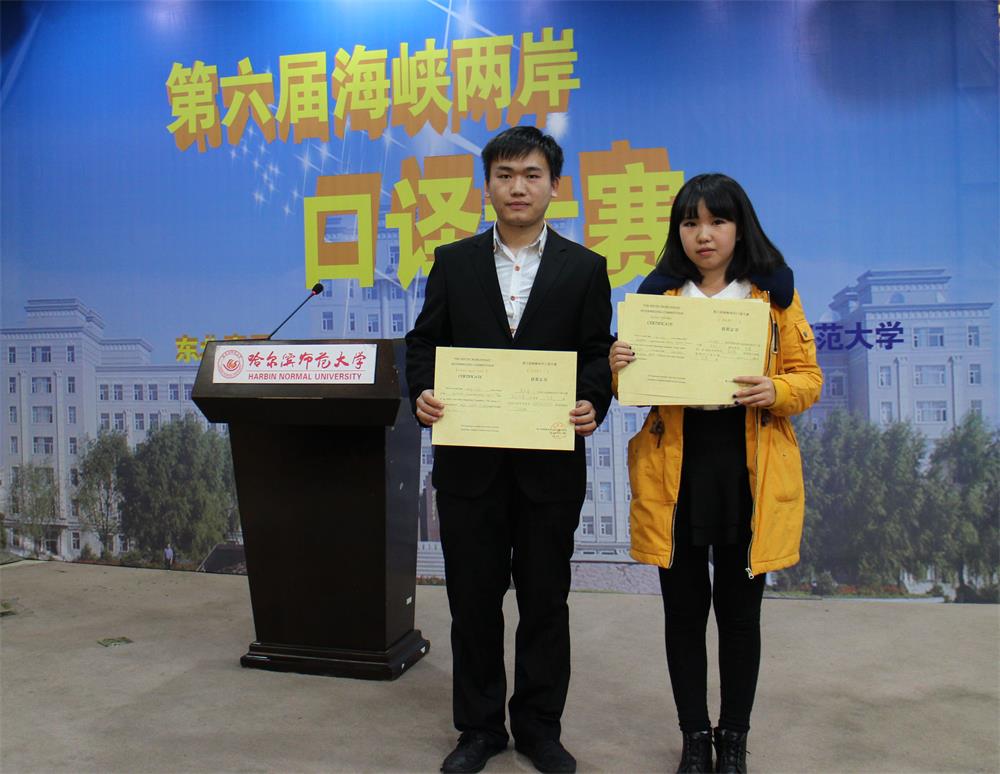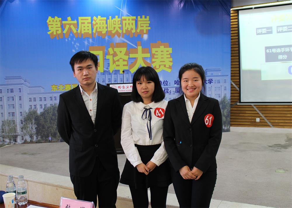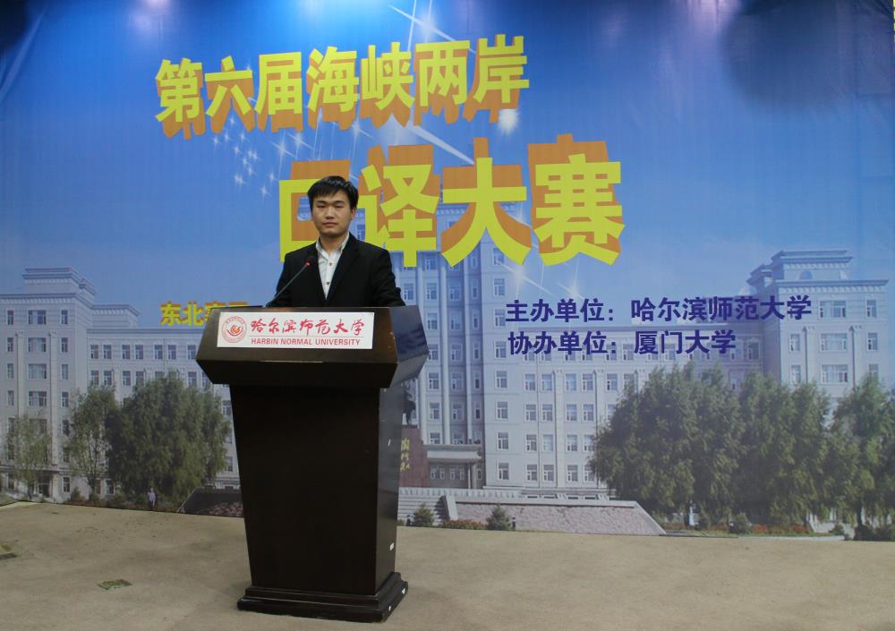 第六届海峡两岸口译大赛东北大区赛于2015年11月14日在哈尔滨师范大学举行,由外语系老师周瑞带领我校的四名学生到哈尔滨师范大学的梦溪宾馆报告厅参加今年口译大赛东北赛区的比赛。