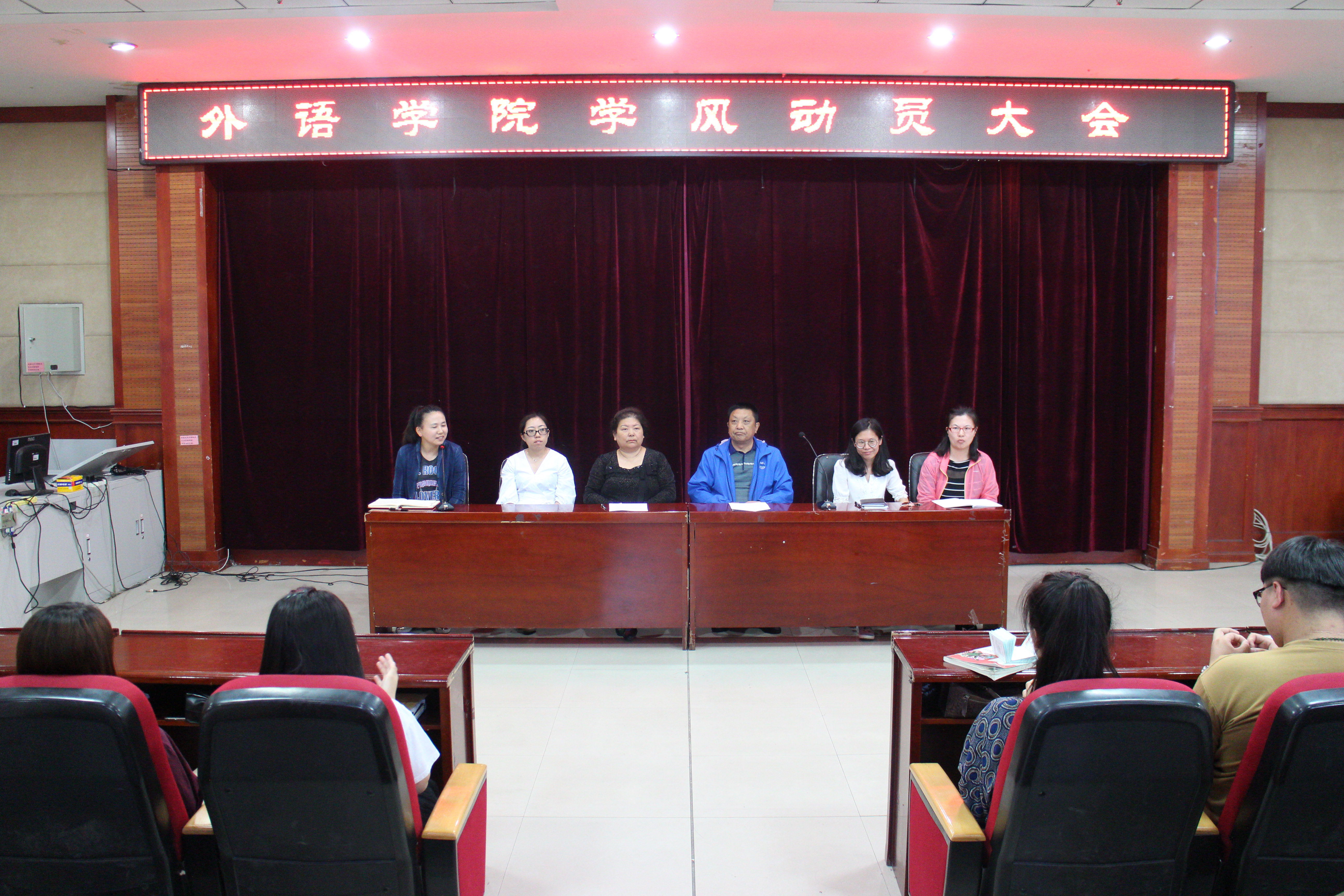 为积极响应学校学风月的号召,调动学生学习积极性,营造良好学习氛围。2017年6月5日正午12时,外语学院于主教518会议室召开“外语学院学风动员大会”。本次大会由外语学院团总支书记孙晓萍老师主持,出席本次大会的嘉宾有外语学院院长王丽娅、外语学院党总支书记王兹林、外语学院副院长高丽娜、外语学院俄语系主任乔雪老师、外语学院英语系主任许梅老师以及外语学院全体成员。