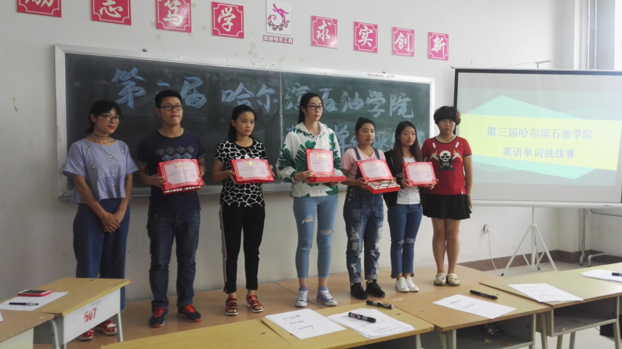 本次外语单词竞赛活动由外语学院组织开展,从5月初开始至6月中旬结束,历时一个半月。参赛学生包括哈尔滨石油学院九个学院共计超过500名学生。经过初赛的激烈角逐, 共计9名学生参加了决赛,决赛中,选手表现优秀、反映敏捷,展示了扎实的英语词汇基础。决赛后,2015级英语专业王宇获得了一等奖,2016级道桥专业高英楠等3名学生获得了二等奖,其余5名学生获得了三等奖。