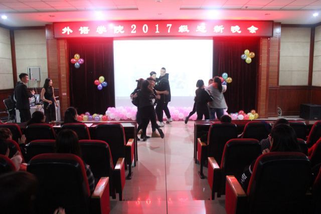 首先由纪凤君,常冬雪学姐为我们带来开场曲《没有什么不同》。外语学院不仅美女多,帅哥也个个都是精英,接下来胡乙涵,赵春江等同学带来了精彩的舞蹈表演《seve》。之后,孙杰、孙玲霞和秦聪学姐在台上舞动的身影,是与你们心跳悸动同步的旋律,是她们为学弟学妹们送上的一份见面礼。2017级英语二班李思源,徐佳宁等用幽默风趣的传统曲艺,将快乐传递给台下的你们。中场游戏爱的抱抱,看你反应够不够快,也将晚会引向了高潮。