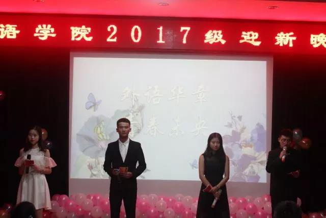 伴随着激昂的音乐声主持人缓步走上舞台,宣布2017外语学院迎新晚会正式开始。