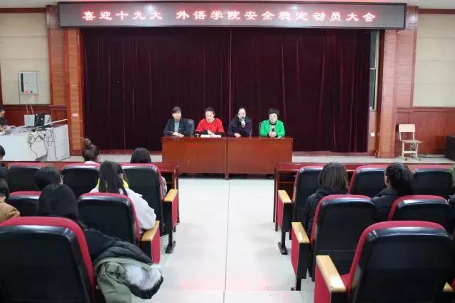 为了迎接党的十九大,也为了进一步推进校园的安全稳定,强化广大师生的校园安全意识,预防和减少校园事故发生,让全校师生们养成良好的习惯,外语学院于2017年10月17日、10月18日两天分别召开了全体教师、全体学生的校园安全稳定动员大会。