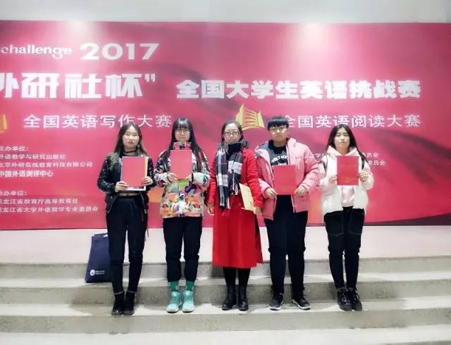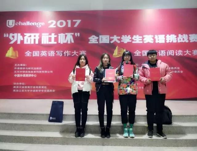 2017年11月4日,我校四位同学在外语学院副院长高丽娜,外语学院英语系副主任朱明艳老师,原琳阳老师,房微老师的带领下参加了2017“外研社杯”全国英语阅读写作大赛黑龙江省复赛,外语学院2016级张亚新和张春香同学获得了英语阅读大赛的省级三等奖,自动控制工程学院2014级的宋抒怡和外语学院2016级的王玥琪同学获得了写作大赛的省级三等奖。