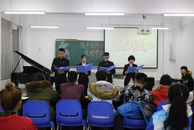 随后,李富豪、王儒涵等带来的《党的光辉》表达对党的敬佩与热爱,鼓舞着我们追逐紧随新时代,热情拥抱新时代。之后由李佳鹤、胡晓晶、陆迪等带来了短剧《董存瑞炸碉堡》以及红歌《强军战歌》;栾晓婷、赵春江表演俄语朗诵以及刘晓旭的钢琴配乐充分展现了俄语学子多才多艺、自信昂扬的语言风采。接下来由高雯带来的《红旗飘飘》更是唱出了赤子爱国之心,点燃了全场的气氛。《上学那些事》,让大家珍视如今难得的同窗情谊。范雨彤带来的民族舞《粉墨》动作柔美、长袖轻佛,舞姿舒展、颤动律延绵连贯。最后,在全体昂扬的共青团团歌的歌声中,本次团活正式结束!