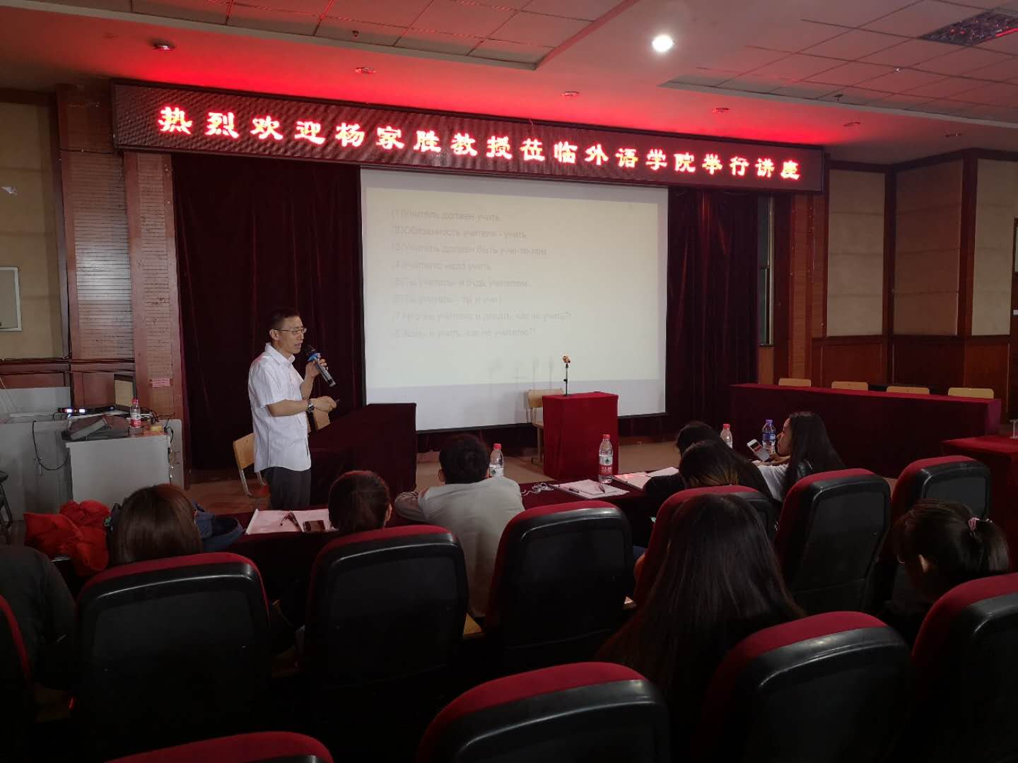 其次,由哈尔滨师范大学杨家胜副教授就俄语的发展详细讲述了即将到来的“一带一路”新时代下的中俄关系。俄罗斯作为“一带一路”上的重要战略国家,与中国交流沟通频繁,俄语人才基数相对较少,专业人才将作为今后国家重点培养型人才。杨教授的演讲十分精彩,让我们提升了对俄语专业的认知度,促进了我们学习专业知识的热情。