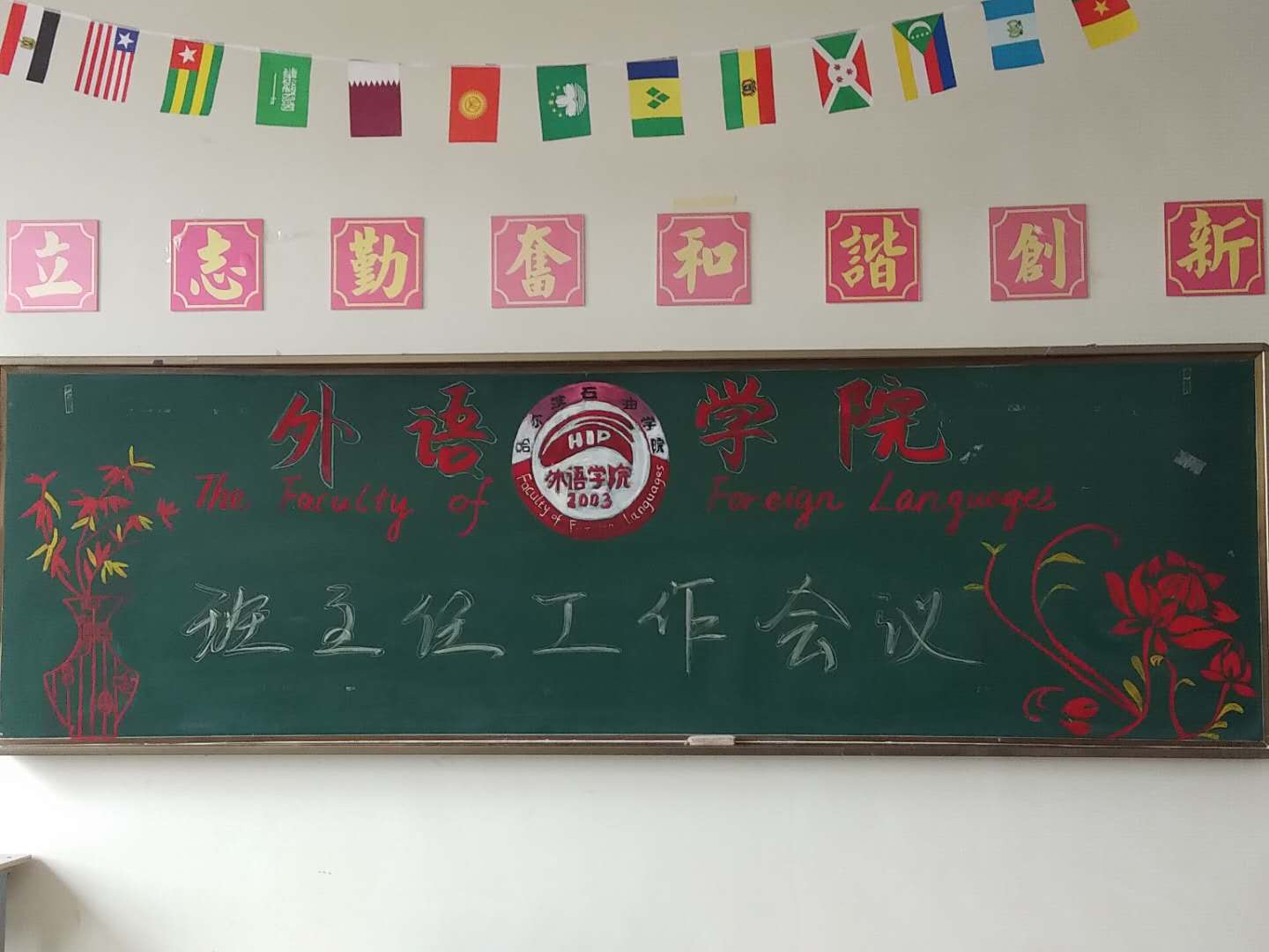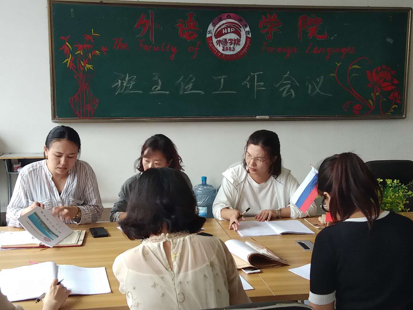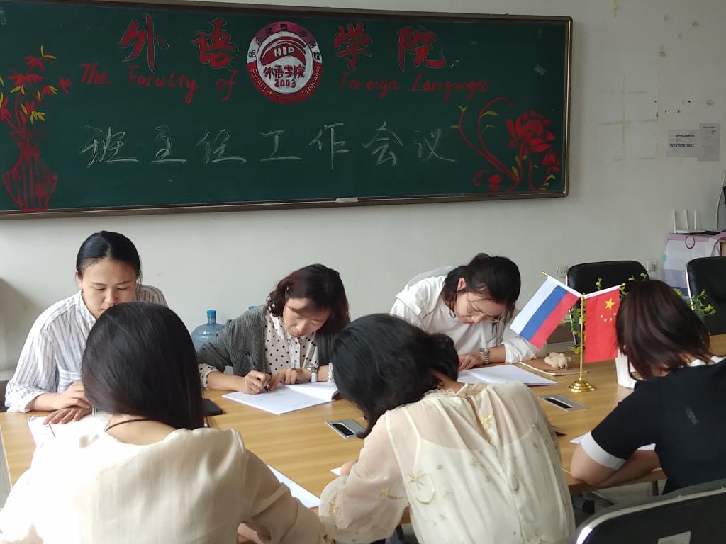 为了明确班主任新学期的重点工作内容,调动全体班主任的积极性,外语学院于2018年8月28日下午在主教515会议室召开了外语学院班主任工作会议。本次会议由外语学院党总支副书记孙晓萍主持,外语学院副院长高丽娜、外语学院2017级2018级全体班主任出席此次会议。