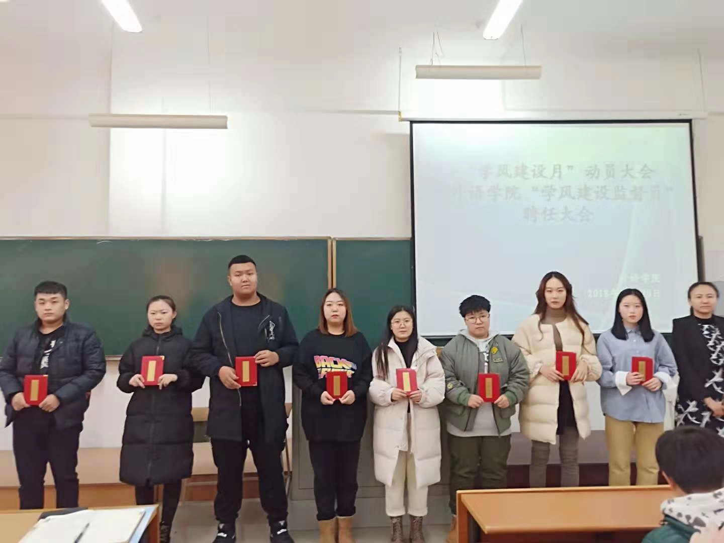 大会上外语学院聘任各个年级优秀同学担任“学风建设监督员”,协助同学们在学习生活中存在的问题尽快得以改善。