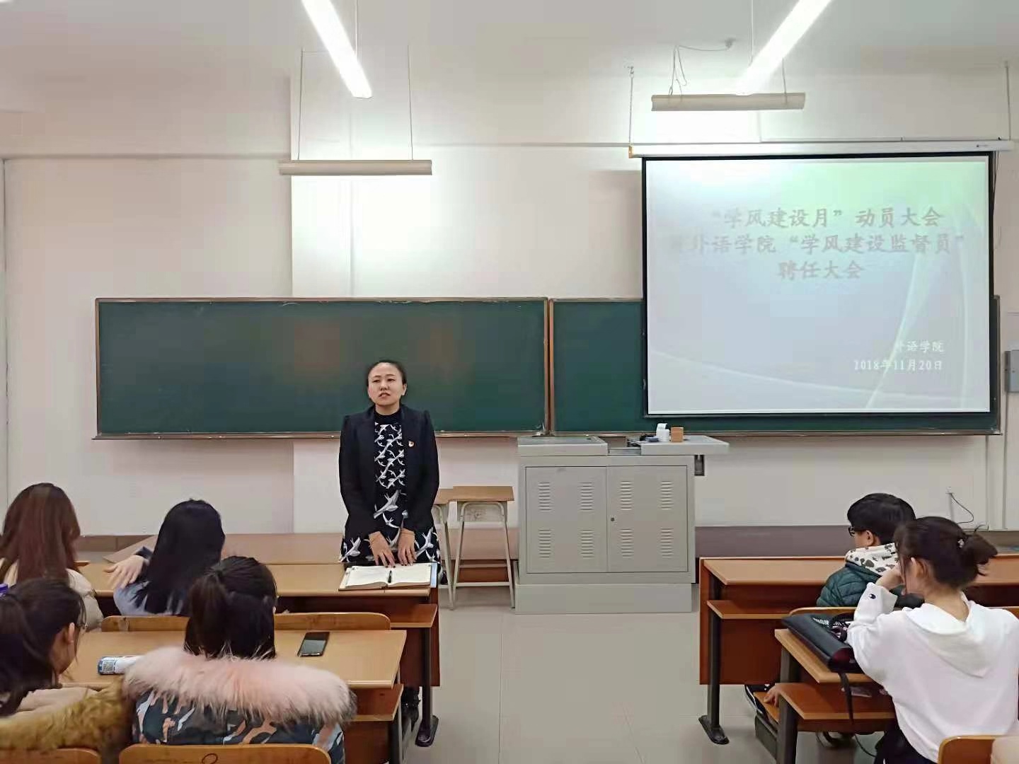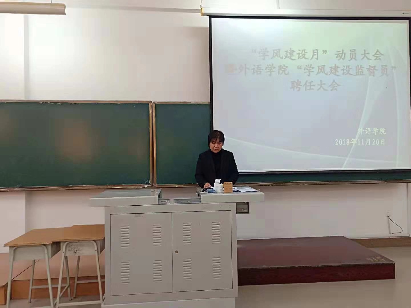 为进一步加强学风建设,响应学校号召,不断激发学生学习的积极性和主动性,规范学生的行为和思想道德的修养,外语学院于2018年11月20日下午在主教517教室召开了外语学院“学风建设月”动员大会暨“学风建设监督员”的聘任大会。此次会议由外语学院辅导员赵连琦主持,外语学院党总支副书记孙晓萍出席了大会。
