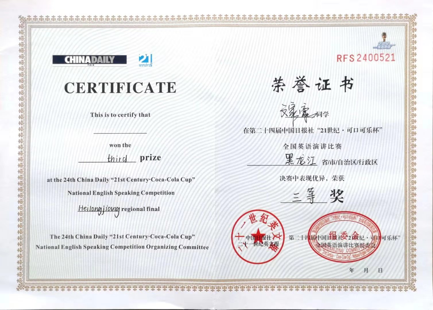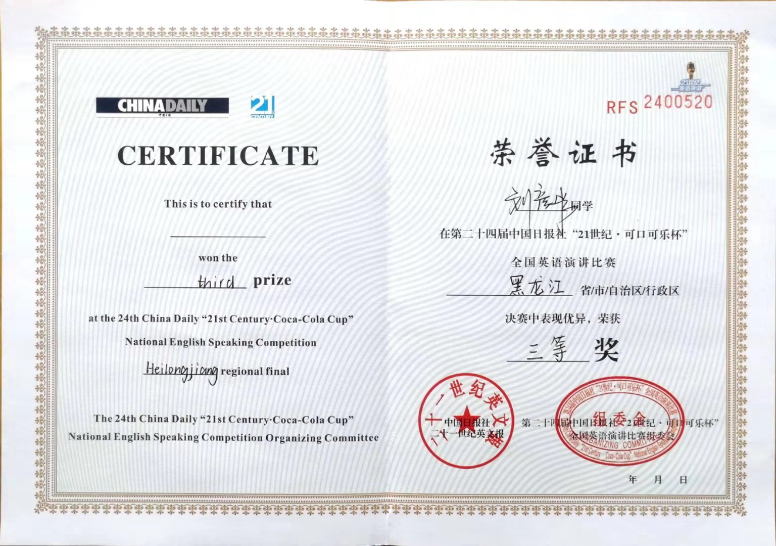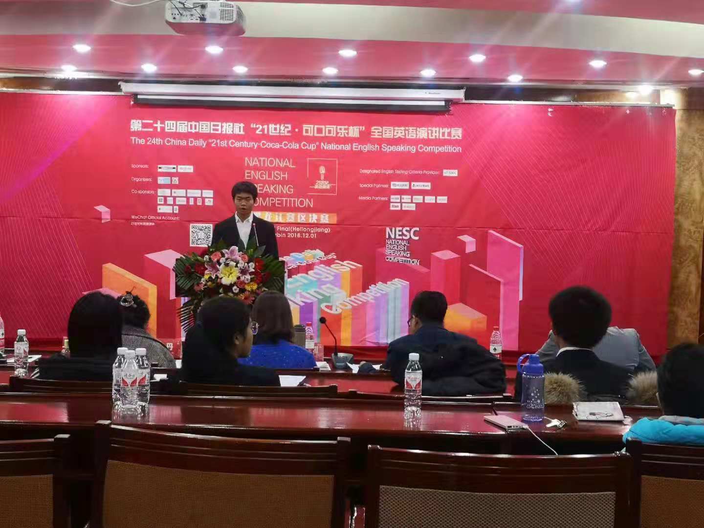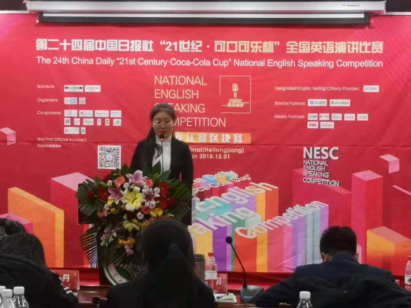 2018年12月1日,第24届中国日报社“21世纪·可口可乐杯”全国英语演讲大赛黑龙江赛区决赛在东北林业大学落幕。我校外语学院2018级刘彦彤和土木工程学院2017级文家豪两位同学代表我校参加了决赛。在指导教师高丽娜和马鑫鑫的悉心指导下,两位同学沉着应战、发挥稳定,最终荣获黑龙江省赛区决赛三等奖。