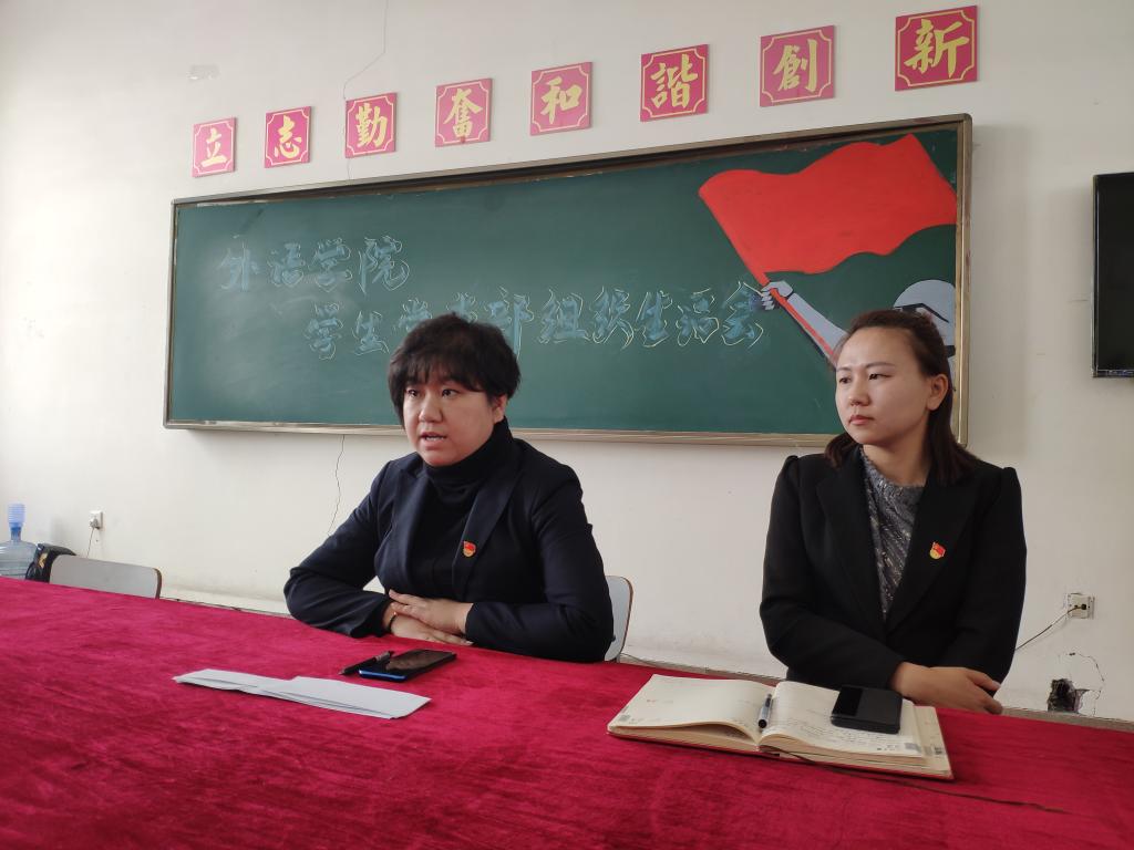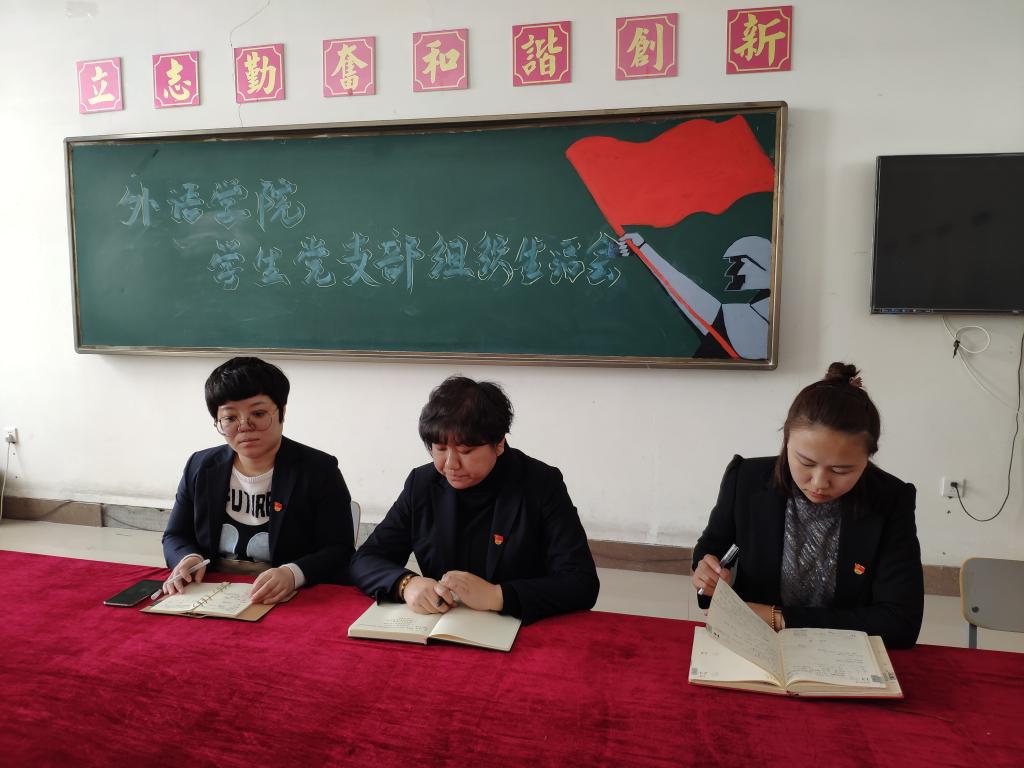 为深入学习贯彻习近平新时代中国特色社会主义思想,引导党员践行合格党员标准,确保当前正在进行的分析评议工作不走过场、不出偏差、取得实效,外语学院学生党支部于3月21日召开了党组织生活会。外语学院党总支副书记孙晓萍、外语学院学生党支部书记赵连琦、外语学院学生党支部组织委员田佳良以及外语学院全体学生党员参加会议。