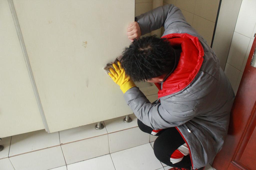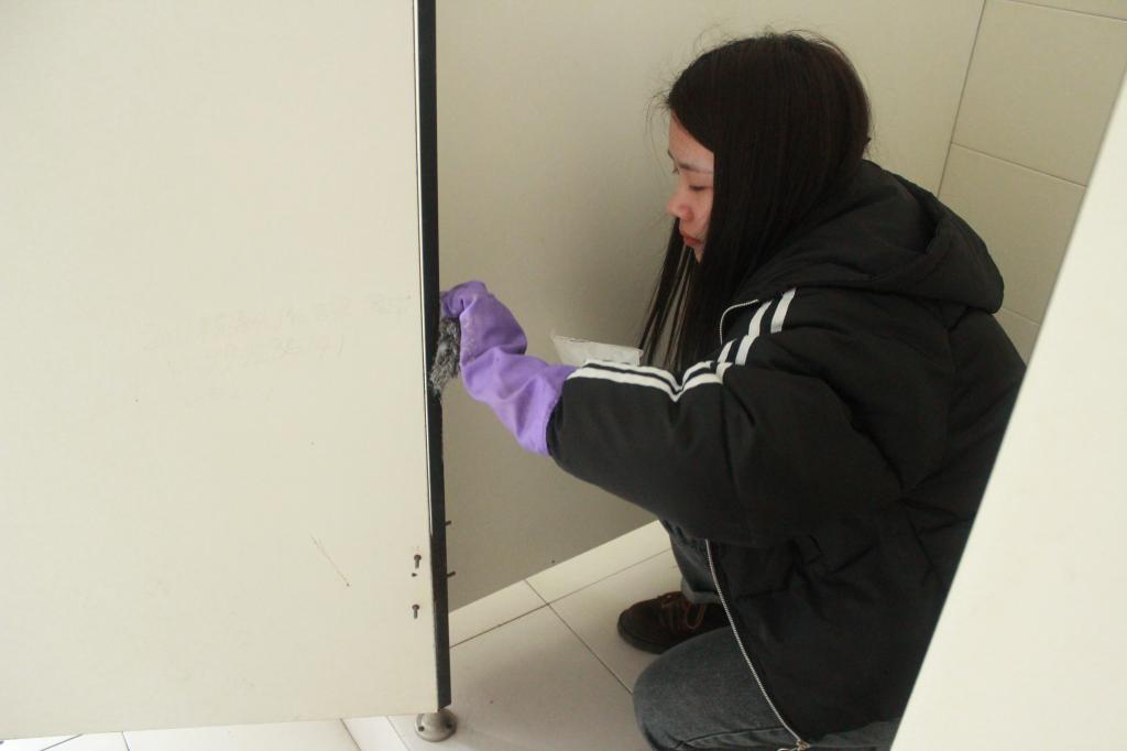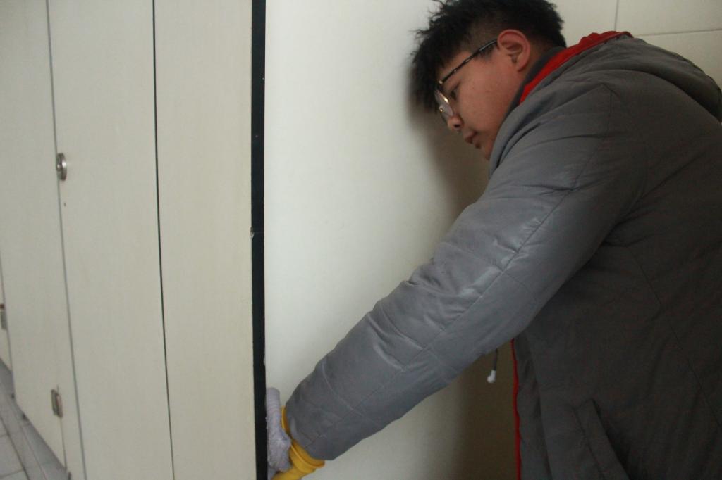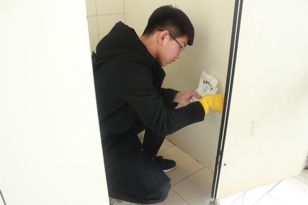 在活动中,志愿者们分工合理、活动开展的井然有序。志愿者们带着小铲子、刷子、喷壶等工具,仔细铲除卫生间墙面上的小广告。志愿者们不怕脏、不怕累,面对形形色色的小广告,一一用铲子进行清理,不给他们留下一丝“生存”空间。经一个小时的努力,将卫生间的小广告清理干净,有效的维护了校园环境的干净整洁。