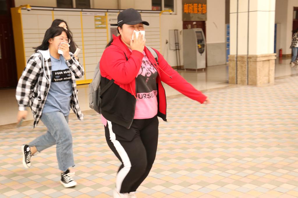 了解相关知识后,外语学院同学开始进行防火演练。大家听到哨声后,在老师的指挥下,捂住口鼻,并弯腰沿着最近的安全通道,井然有序地撤离逃生。到达指定地点后,保卫处老师为我们再次着重介绍了灭火器的种类,和使用方法以及报警常识。