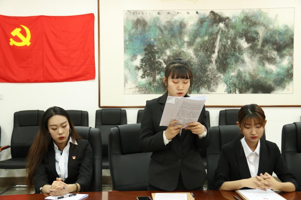 本次大会严格按照党组织接收预备党员程序。大会开始,发展对象们逐一宣读《入党志愿书》。随后,入党介绍人分别介绍了王丹、梅冬雪、高雯、温成磊四名同志的基本情况,外语学院党总支副书记孙晓萍报告了党支部对四名同志的审查情况。与会党员进行了充分讨论,分别对四名同志在考察期间生活、学习、思想等各方面的情况作了如实的评价,均同意推荐接收王丹、梅冬雪、高雯、温成磊四名同志为预备党员。经过外语学院党支部大会无记名投票,全票表决通过接收王丹、梅冬雪、高雯、温成磊四名同志为中共预备党员。最后,党支部副书记孙晓萍宣布决议,外语学院党支部同意接收王丹、梅冬雪、高雯、温成磊四名同志为中共预备党员。