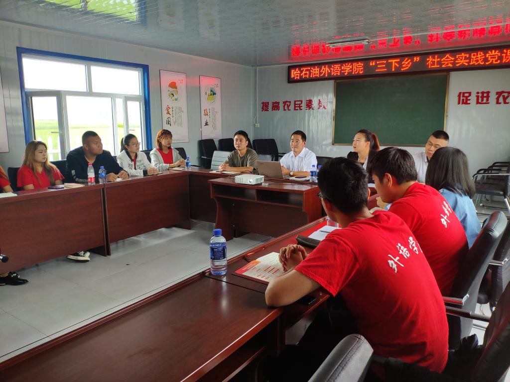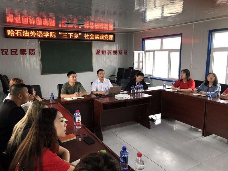 2019年8月16日,外语学院党总支副书记孙晓萍和学生党员们来到延寿县金凤村,由市工信局驻金凤村工作队队长、第一书记王锋为大家上了一堂“三下乡”社会实践党课。