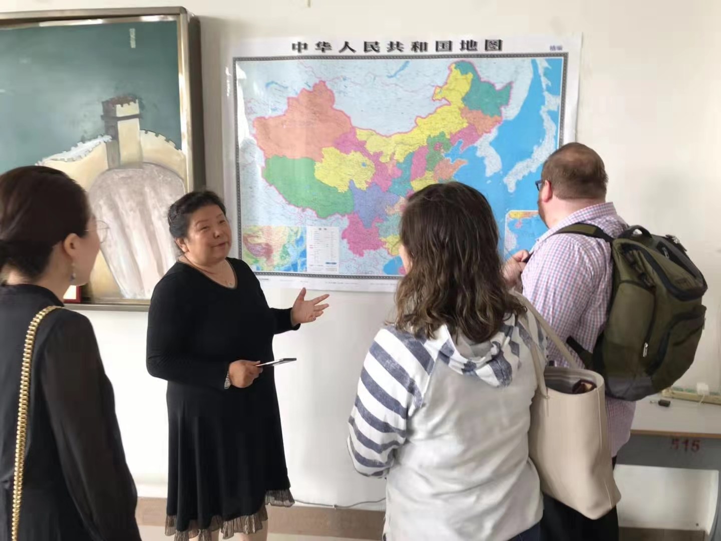 随后,一行人参观了国际教育学院的活动室和国际生的汉语课堂。两位美国艺术家和国际生们一起练习了汉语拼音的发音和语调。