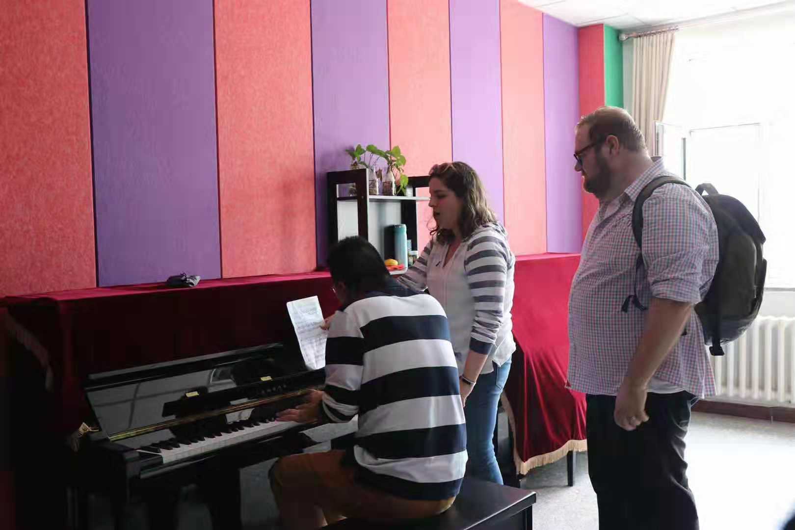 参观完国际教育学院后,嘉宾们到艺术学院进行了访问,艺术学院院领导及骨干教师向嘉宾们介绍了艺术学院音乐表演方向的学科建设和发展情况,在艺术学院的钢琴室里,任中凯先生亲自弹琴,音乐系主任孙玉明和教师孔维克带领学生同嘉宾们共同演唱了意大利歌剧的经典片段La donna e mobile和中国民歌《茉莉花》等经典中外歌曲。最后两位美国艺术家与我院师生在《我爱你中国》的歌声中结束了此次活动。