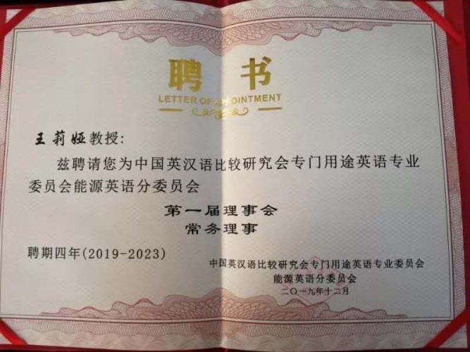 2019年12月21日上午,中国能源英语研究会成立大会在中国石油大学(北京)举行,外语学院院长王莉娅教授作为哈尔滨石油学院代表参加了大会,被授予常务理事的称号。复旦大学、中国地质大学、中国矿业大学、中国科学院大学、上海电力大学和中国石油大学(华东)等全国41所高校的120余名中外专家学者参加了本届大会。