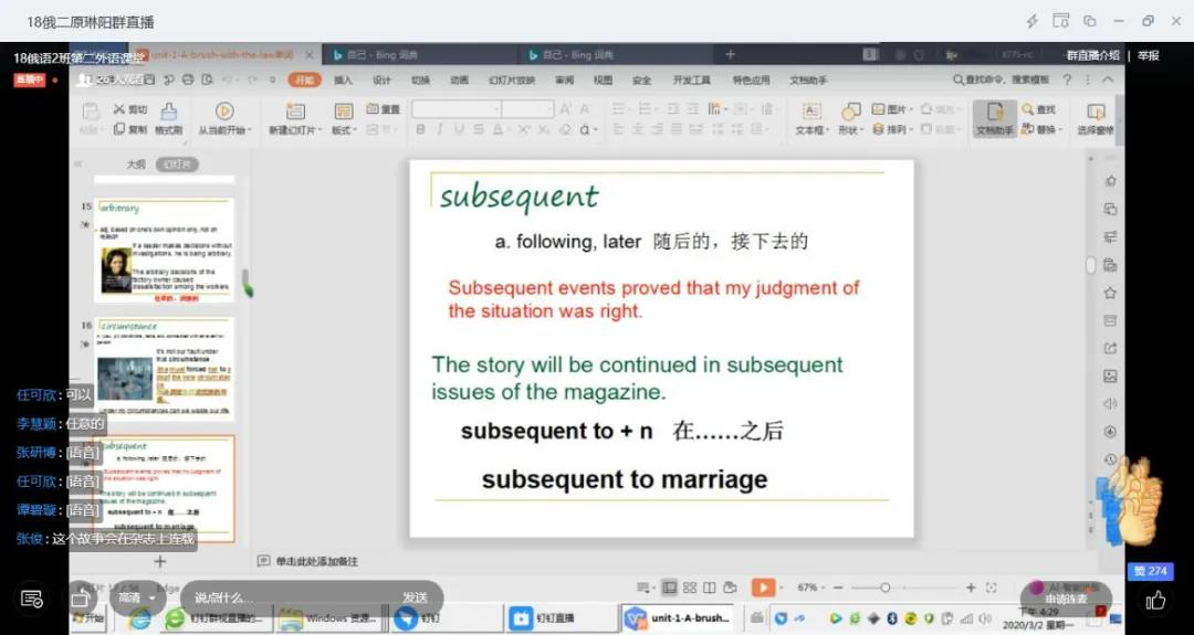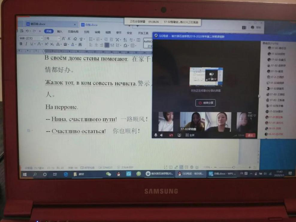 网络授课第一天,俄语系各门课程进行顺利,全部顺利完成授课任务。老师们都提前跟学生沟通说明了课堂要求,学生配合度高,老师们的整体授课体验良好:有的老师使用学习通配合QQ群,但上午学习通较卡顿,所以以QQ群为主,老师提前录好了视频课发给学生,学生观看后进行反馈和语音提问,并要求学生记好笔记时时拍照,提前录课的好处是如果有学生网络不好可以课后随时回看,并且提前录课可以让学生反复观看复习。老师提前在学习通发放了资料,直播课上以互动提问为主,直播可以分享屏幕,互动效果好。各平台的使用反馈:学习通适合上提前上传资料,给学生发讨论和作业,方便数据统计;QQ群、钉钉群、腾讯会议平台稳定,适合直播,互动效果更好。