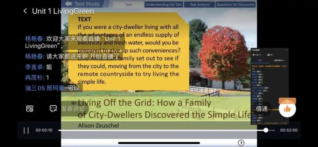 杨艳春:上周已经提前测试好,提前5分钟打卡入群。WeLearn上自主预习,在自带课程之外建立了二级微课。提前跟学生布置好预习任务,上课利用前十分钟进行了学习要求,包括作业、笔记形式;上半程用了直播形式,讲了课文的一部分,后半程用视频会议监督学生学习情况及面对面互动。学生积极主动,效果不错。