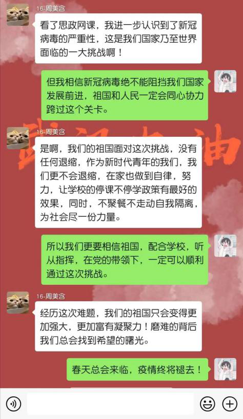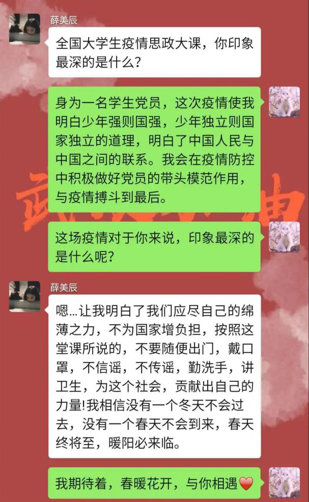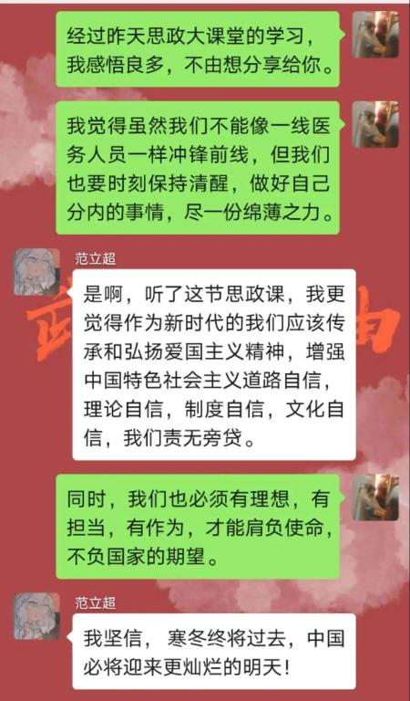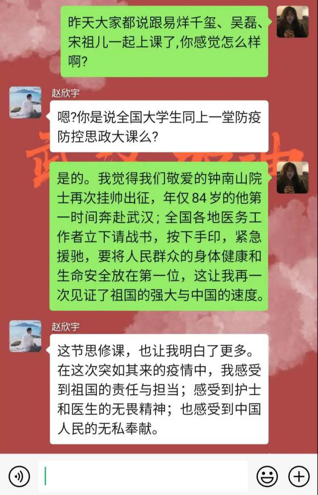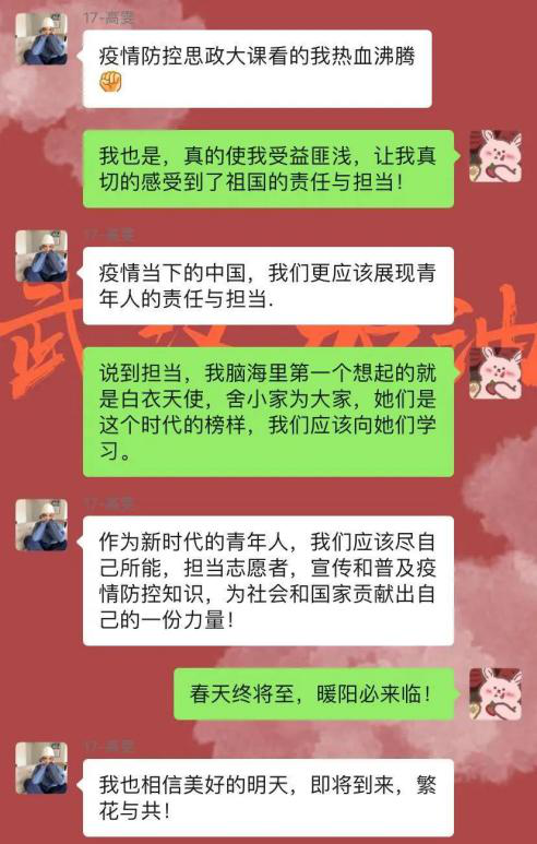 大课学习中,最让广大青年学子触动的是青年的责任与担当,在这场没有硝烟但却要直面生死的战役中,大学生群体担起了历史使命,将青春梦想扎根在祖国的广袤大地上。“苟利国家生死以,岂因祸福避趋之。”青年,是时代的兴起,也是一个国家的未来。每一代青年担当责任的样子,成就了这个国家和民族的当下和未来。思及此,观看网课之后外语学子纷纷进行讨论与交流,表达了各自的感悟: