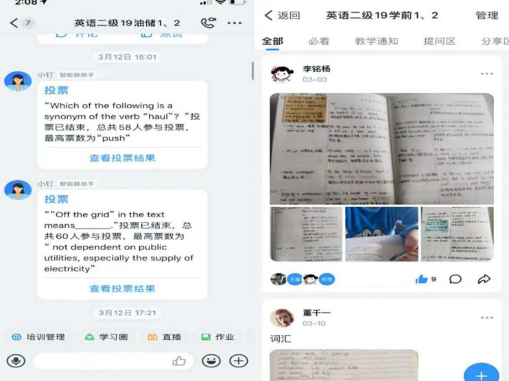 大学外语部杨艳春老师:为了防止学生们第一次上网课不知所措,我做了《2020大学英语在线学习计划表》帮助他们合理安排学习时间和进度。上课时,采取混合式方式,即WElearn 自主学习后,再结合钉钉直播讲解、答疑。上课前会采取群内投票,圈内分享笔记,作业模式进行互动,同学之间可以互相评论点赞。经过两周的实践,在跟学生的沟通中学生表示自主学习能力有了提高,对英语的兴趣更加浓厚。