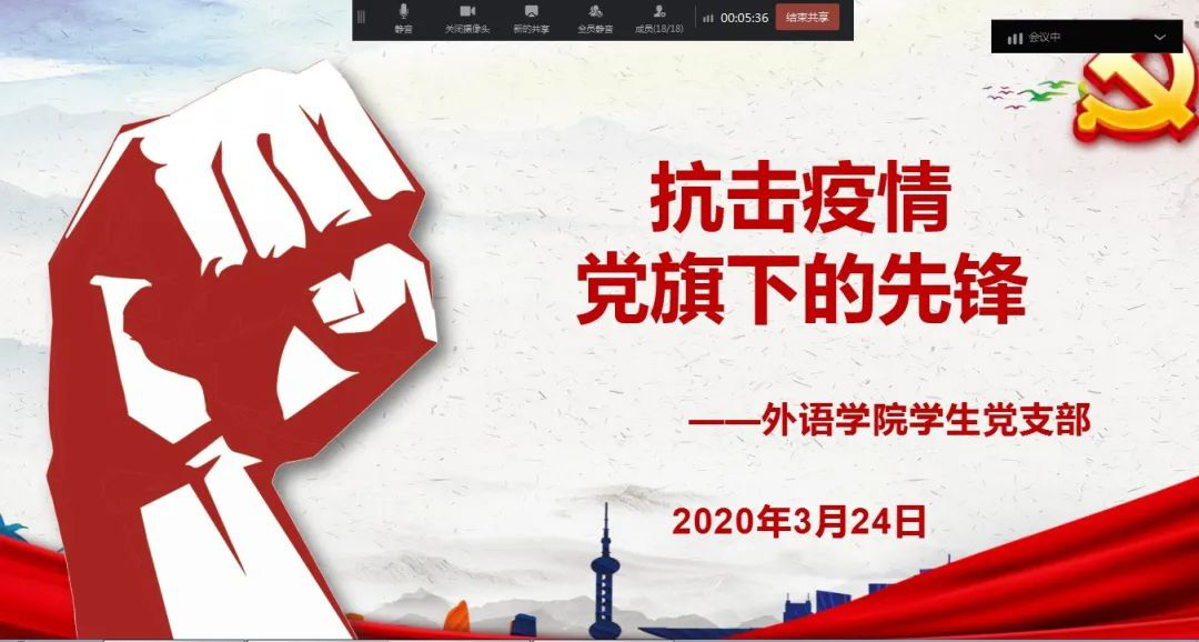 为深入贯彻落实习近平总书记关于疫情防控工作的重要讲话和重要指示批示精神,积极响应校党委关于在疫情期间组织开展党课学习活动的工作要求,更好的发挥基层党组织战斗堡垒和党员的先锋模范作用,3月24日晚,外语学院学生党支部采用网络视频会议的方式开展了一场《抗击疫情,党旗下的先锋》的主题党日活动。本次会议由学生党支部书记赵连琦老师主持,支部16名学生党员参加了会议并围绕自己疫情期间的学习和生活发表了感想。