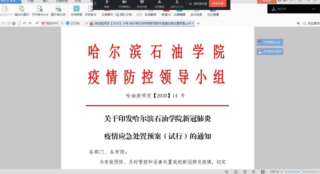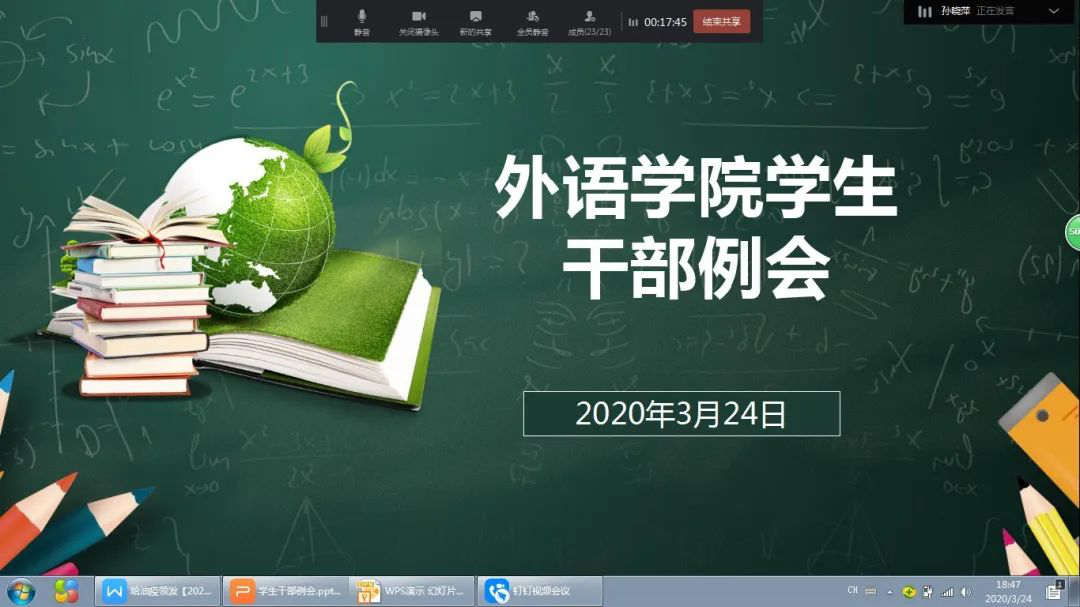 在全国上下众志成城,全面开展防控疫情阻击战的关键时期,为有效预防、及时管控和妥善处置我院新冠肺炎疫情,切实提高应对疫情能力,保障我院师生的生命安全和身体健康,我院根据《哈尔滨石油学院新冠肺炎疫情应急处置预案(试行)》于3月24日召开学生干部线上会议。外语学院党总支副书记孙晓萍,各班级班长、团支书参加会议。外语学院学团办公室主任赵连琦主持会议。