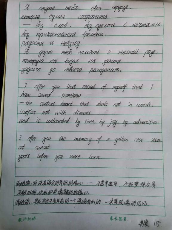 在举国上下众志成城抗击疫情的特殊时期,我们抗疫不停学。外语学院积极拓展多种形式的学习方法,力求“线上”“线下”教学互相结合、补充,以满足同学们求学需求,实现居家抗疫、在线学习两不误、两促进。为丰富同学们的文化生活,外语学院开展英语俄语美文摘抄活动,现将美文展示如下: