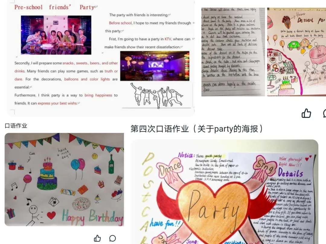 在《英语口语》课程中,我会让学生自主设计与教学话题相关的海报,在课堂上举办分享展览会,让学生在介绍描述自己作品的同时,锻炼语言表达技能,同时在聆听他们表述的过程中,也能够积累更多的词汇语句,遇见表述中小错误我会随时进行纠正,让学生在分享中不断学习,在反思中不断成长。