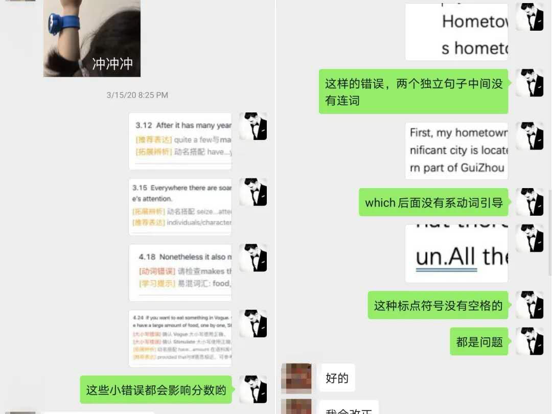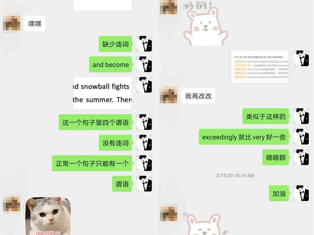 除了在课上随时帮助学生答疑解惑,在近期我还叮嘱学生有问题可以随时给我私信,通过这种方式,我帮助很多同学指导了语言表达,修改了作文,给出合理化的写作意见,最大化辅助提高学生的课后自主学习效率。