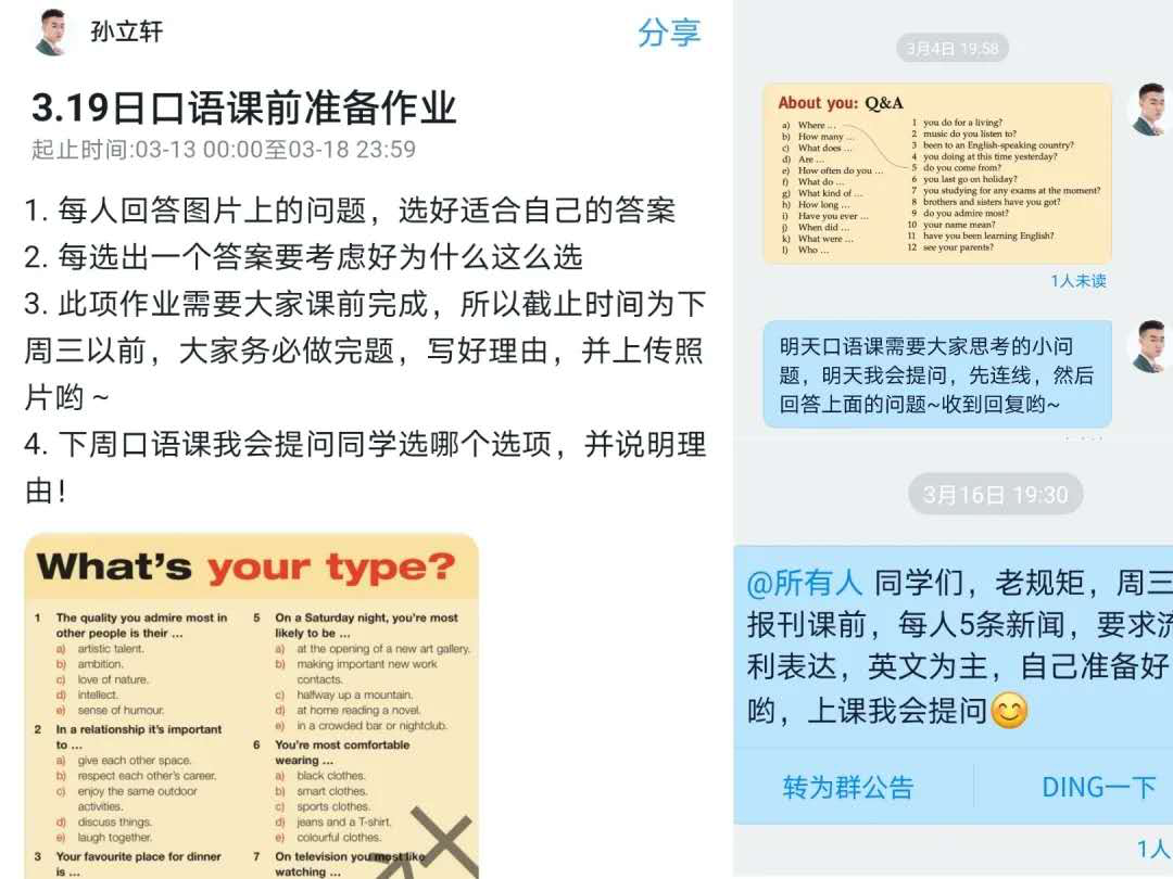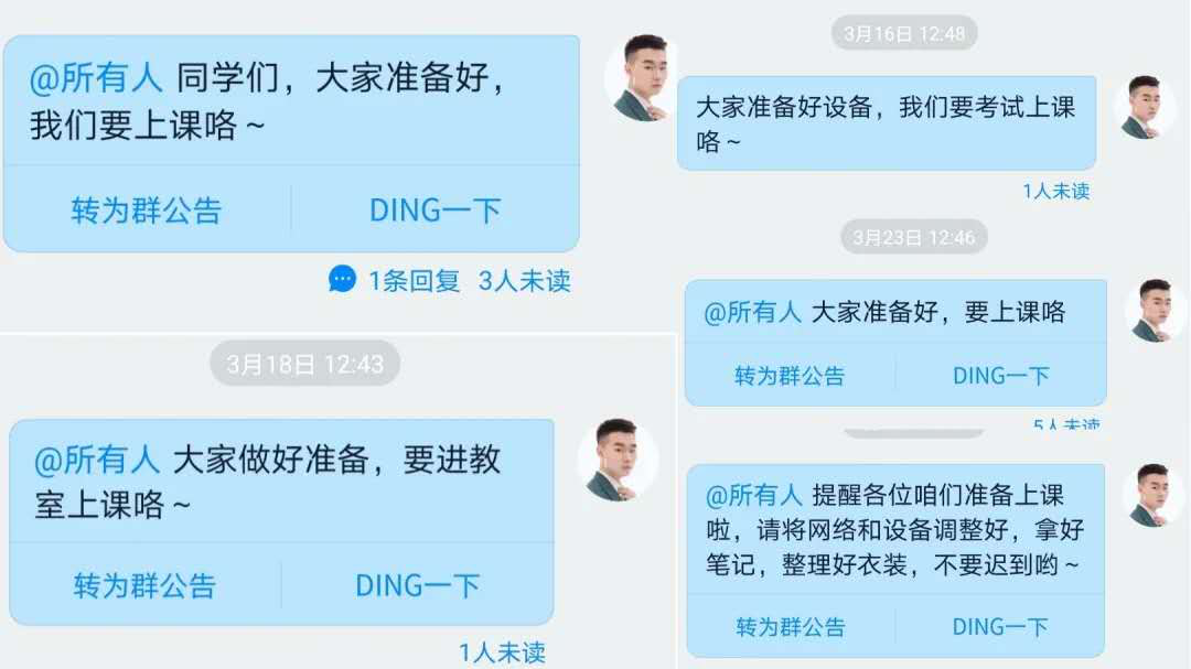 每节课前5-15分钟,我都会在钉钉软件上提醒学生准备上课,让学生提早进入到学习状态,有效利用课堂时间。